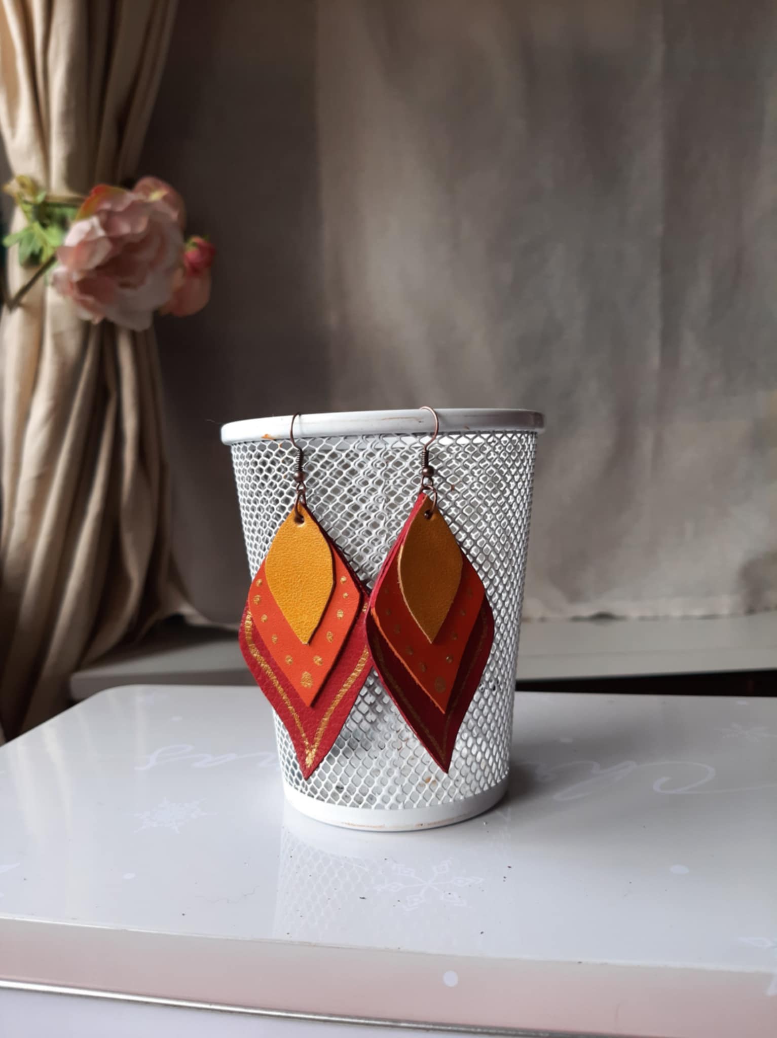Cercei din piele naturala executati si pictati manual , dublati , lungime de 5 cm, cu tortita din inox