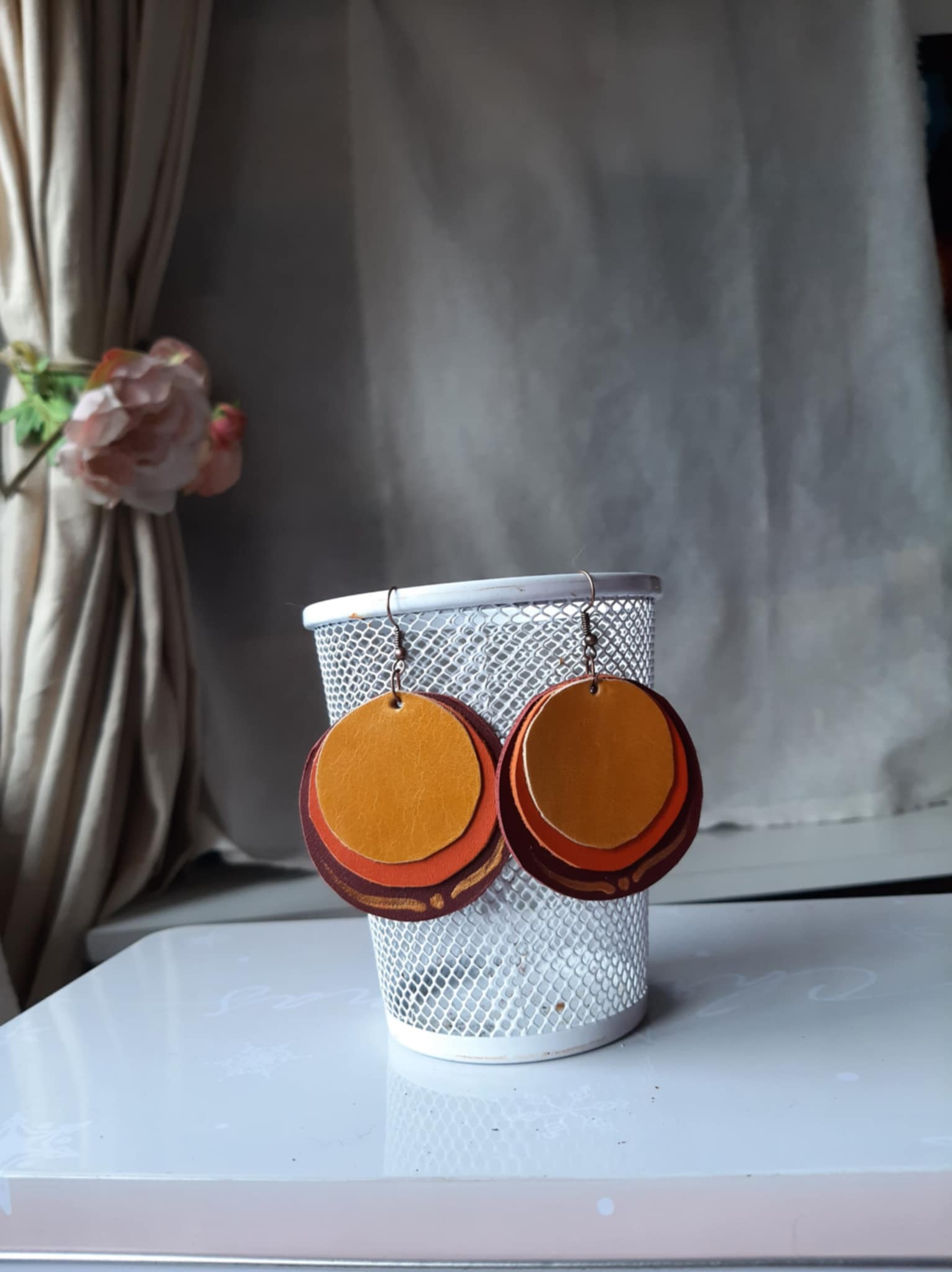 Cercei din piele naturala executati si pictati manual , dublati , lungime 5 cm, cu tortita din inox.