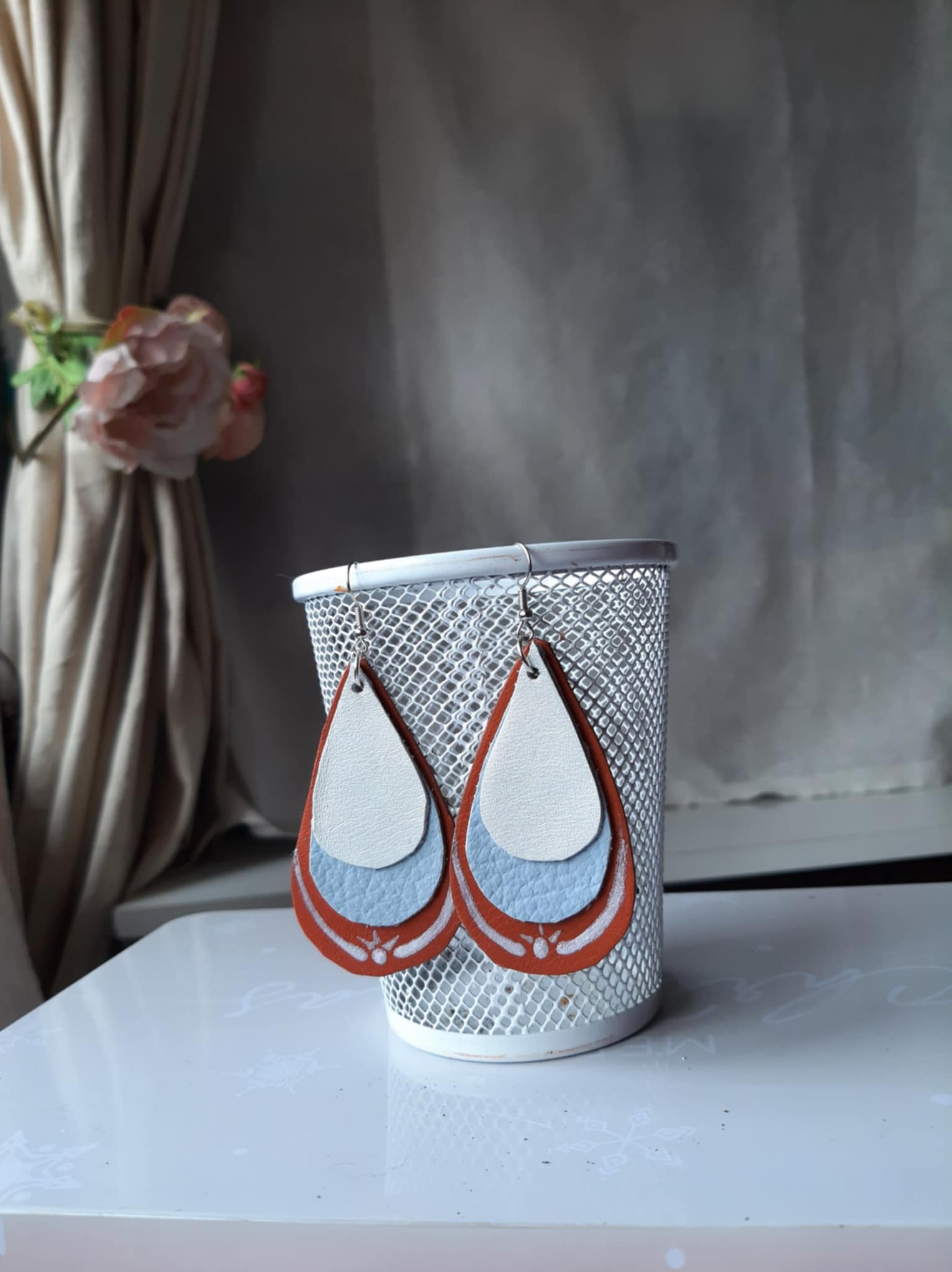 Cercei din piele naturala executati si pictati manual, dublati , 5 cm lungime, cu tortita din inox.