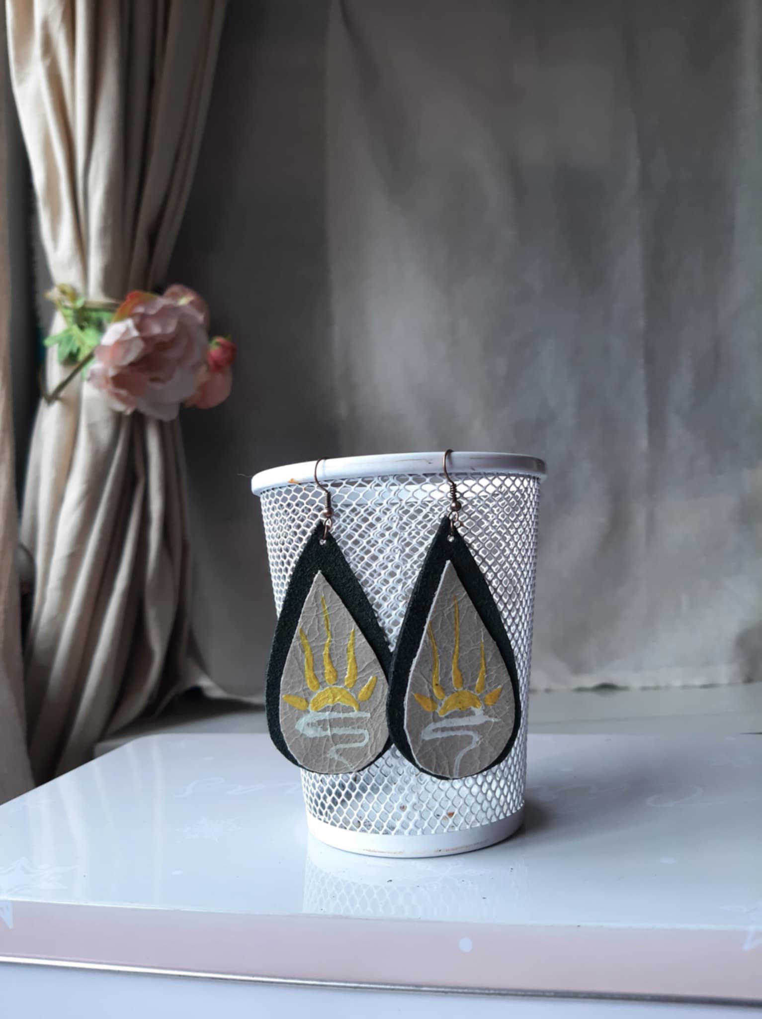 Cercei din piele naturala executati si pictati manual , dublati , cu tortita din inox , lungimea totala incluzand tortita este de 5 cm.