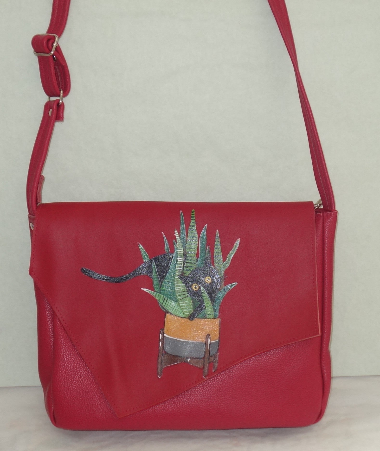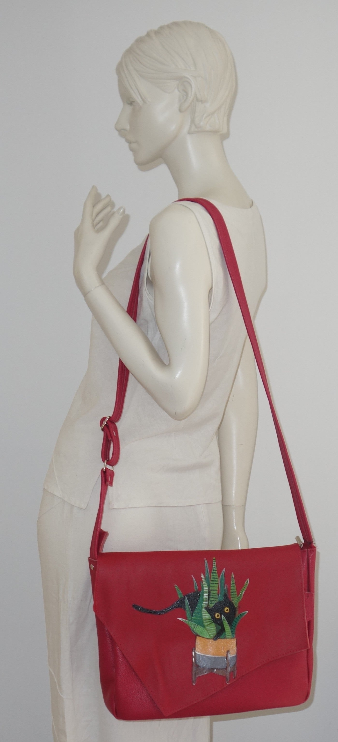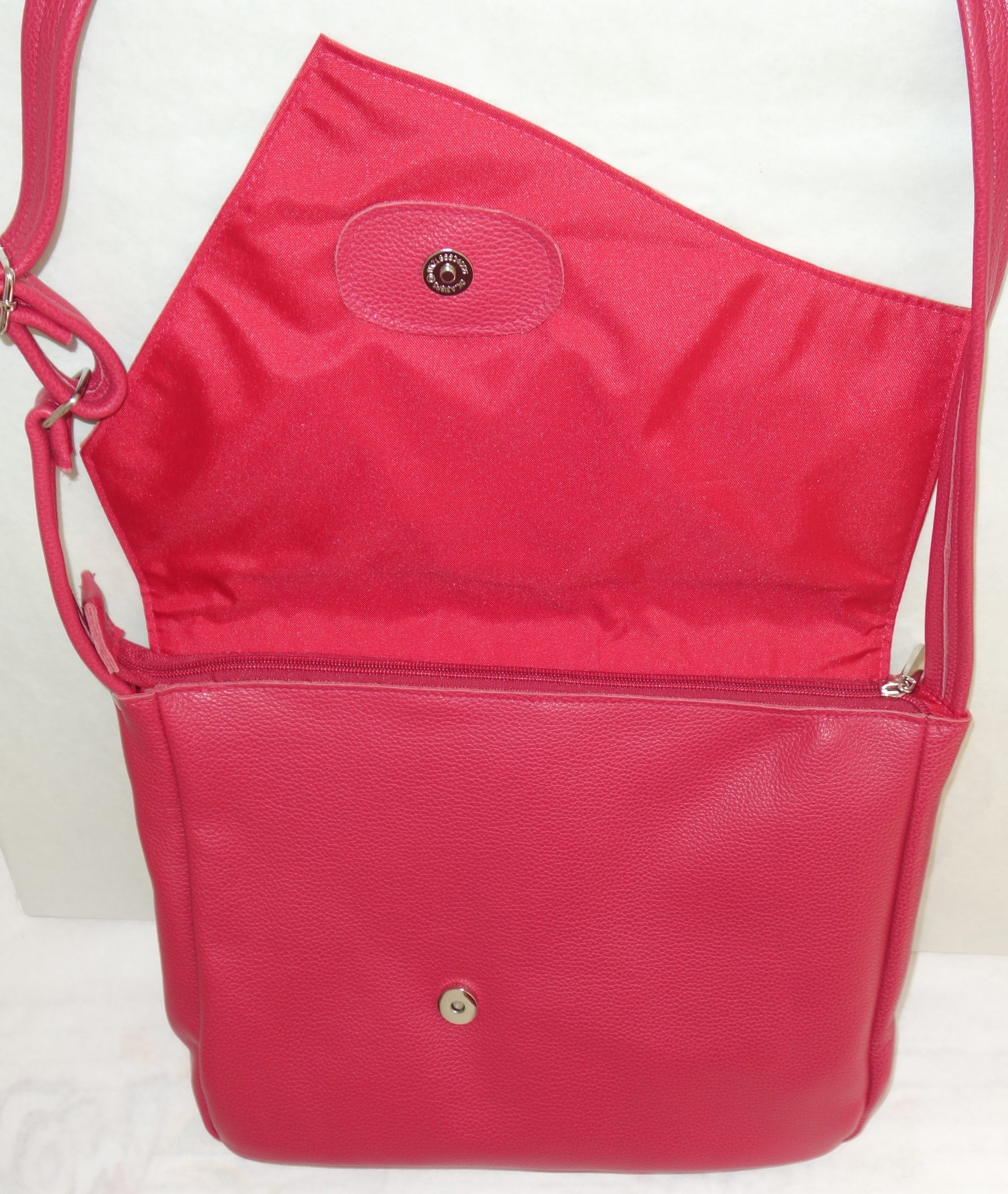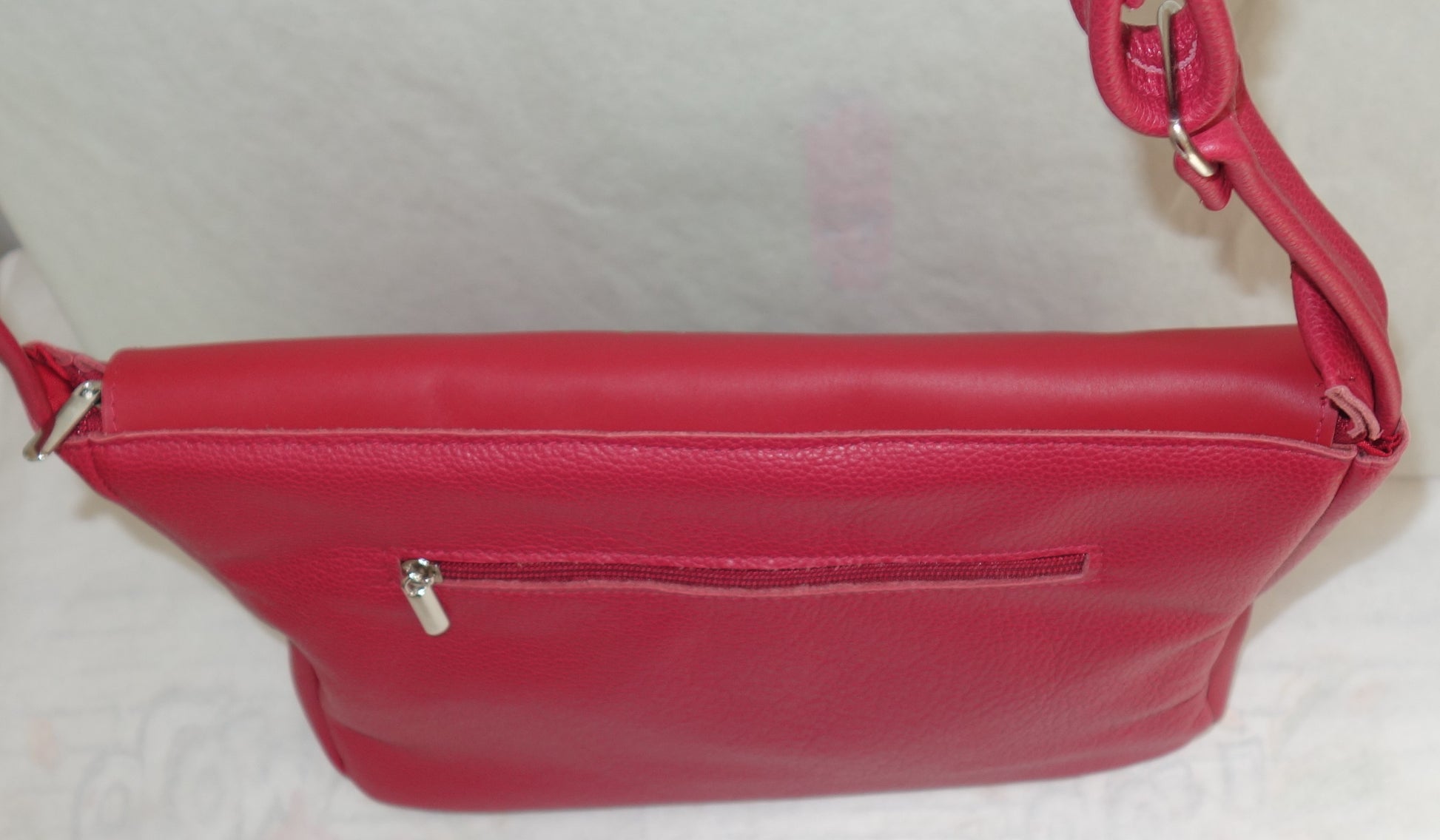 Geanta de piele naturala rosie ,cu doua buzunare interioare dintre care unul cu fermoar, inchidere cu fermoar si capsa magnetica. Dimensiuni 31 cm latime pe centru , 24 cm inaltime , baza de 7 cm , bareta reglabila de 115 cm lungime.