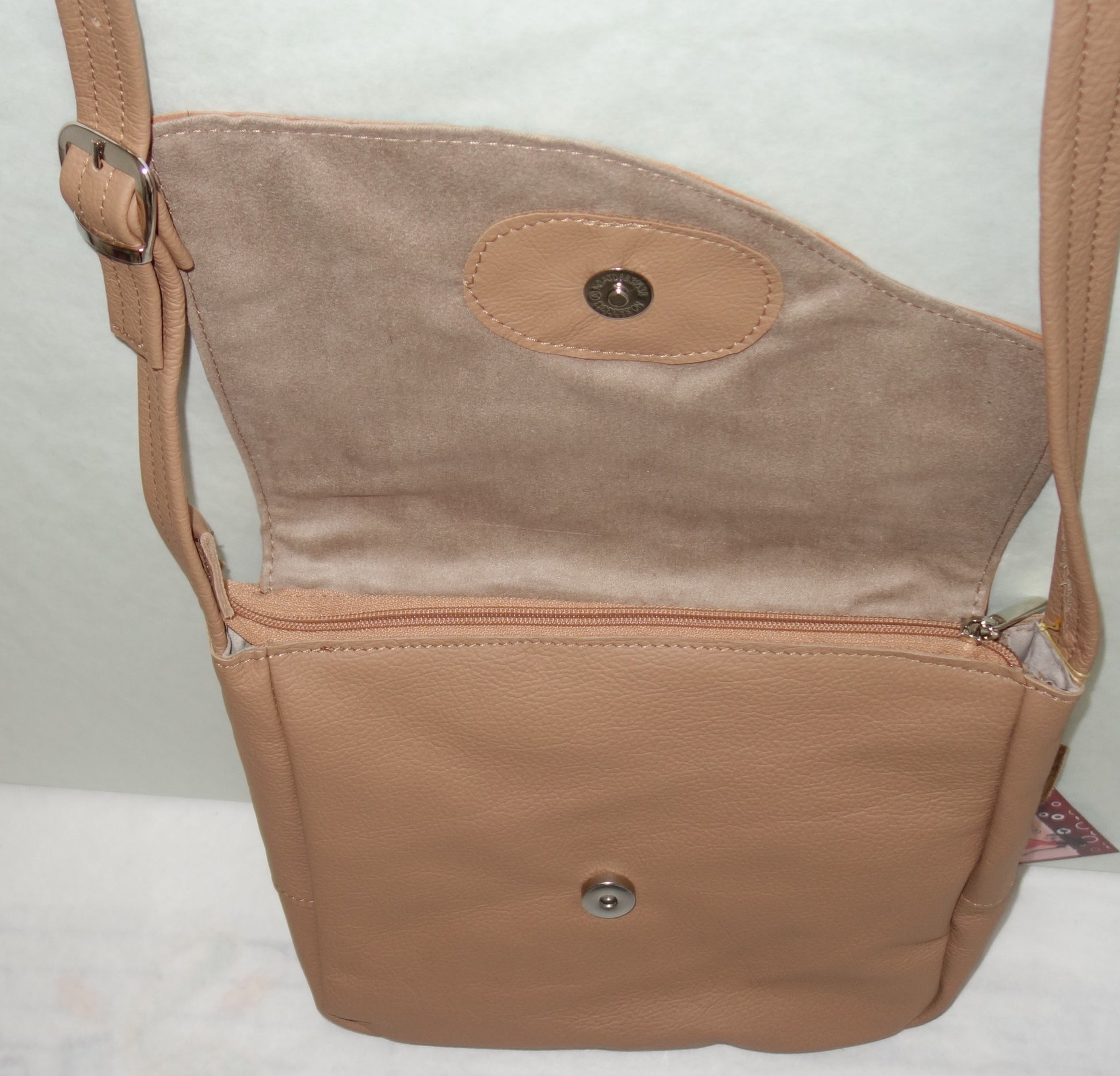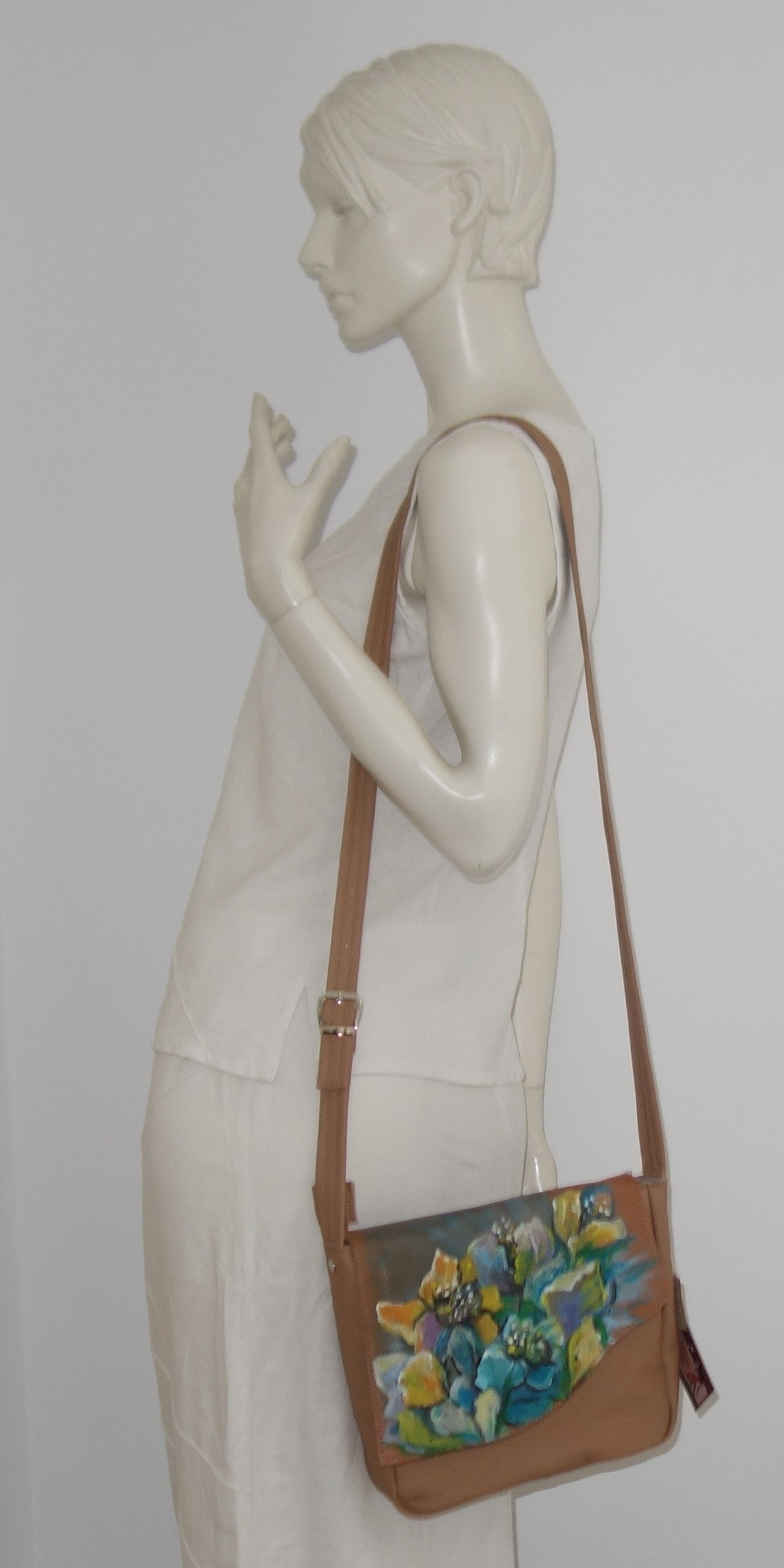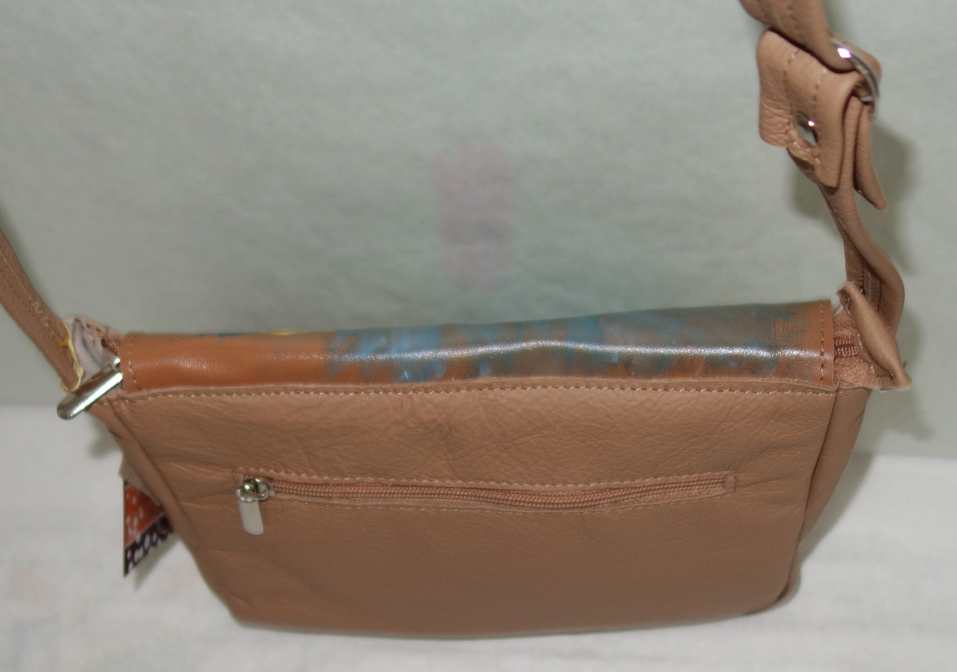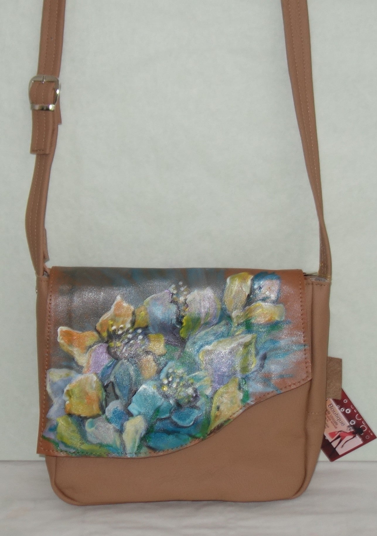 Geanta de piele naturala maro cappucino, pictata cu vopsele speciale pentru piele, rezistente la apa si in timp,, cu doua buzunare interioare dintre care unul cu fermoar , inchidere cu fermoar. Dimensiuni 23 cm latime pe centru , 21 cm inaltime , baza de 7 cm, bareta reglabila de 125 cm lungime .