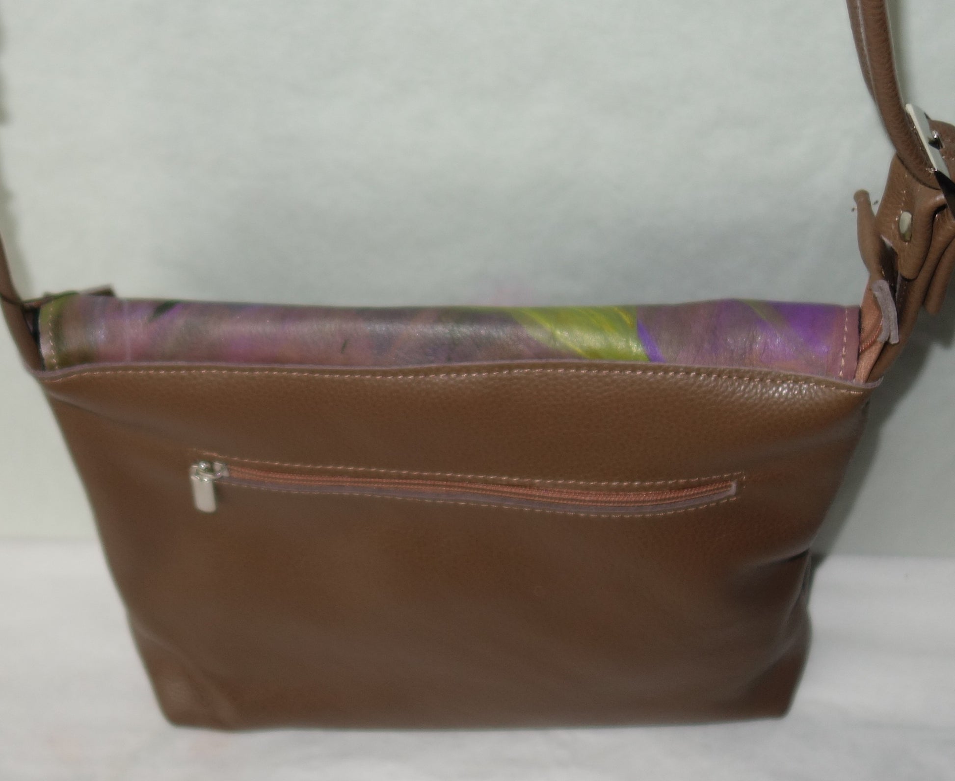 Geanta de piele naturala maro, cu doua buzunare interioare dintre care unul cu fermoar , inchidere cu fermoar si capsa magnetica . Dimensiuni 32 cm latime pe centru, 25 cm inaltime, baza de 7 cm, bareta de 125 cm lungime. Pictata cu vopsele speciale pentru piele, rezistente la apa si in timp.