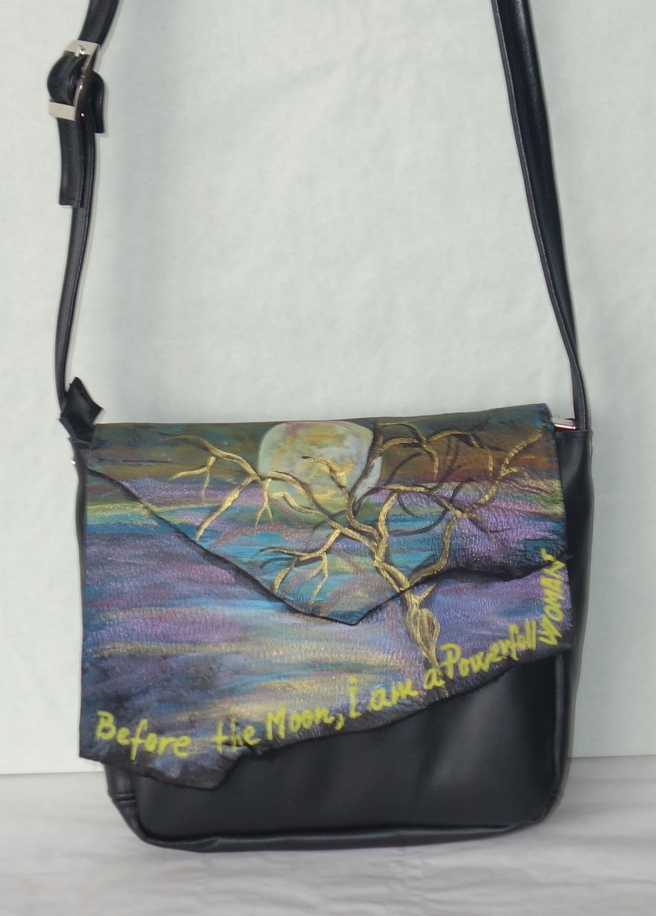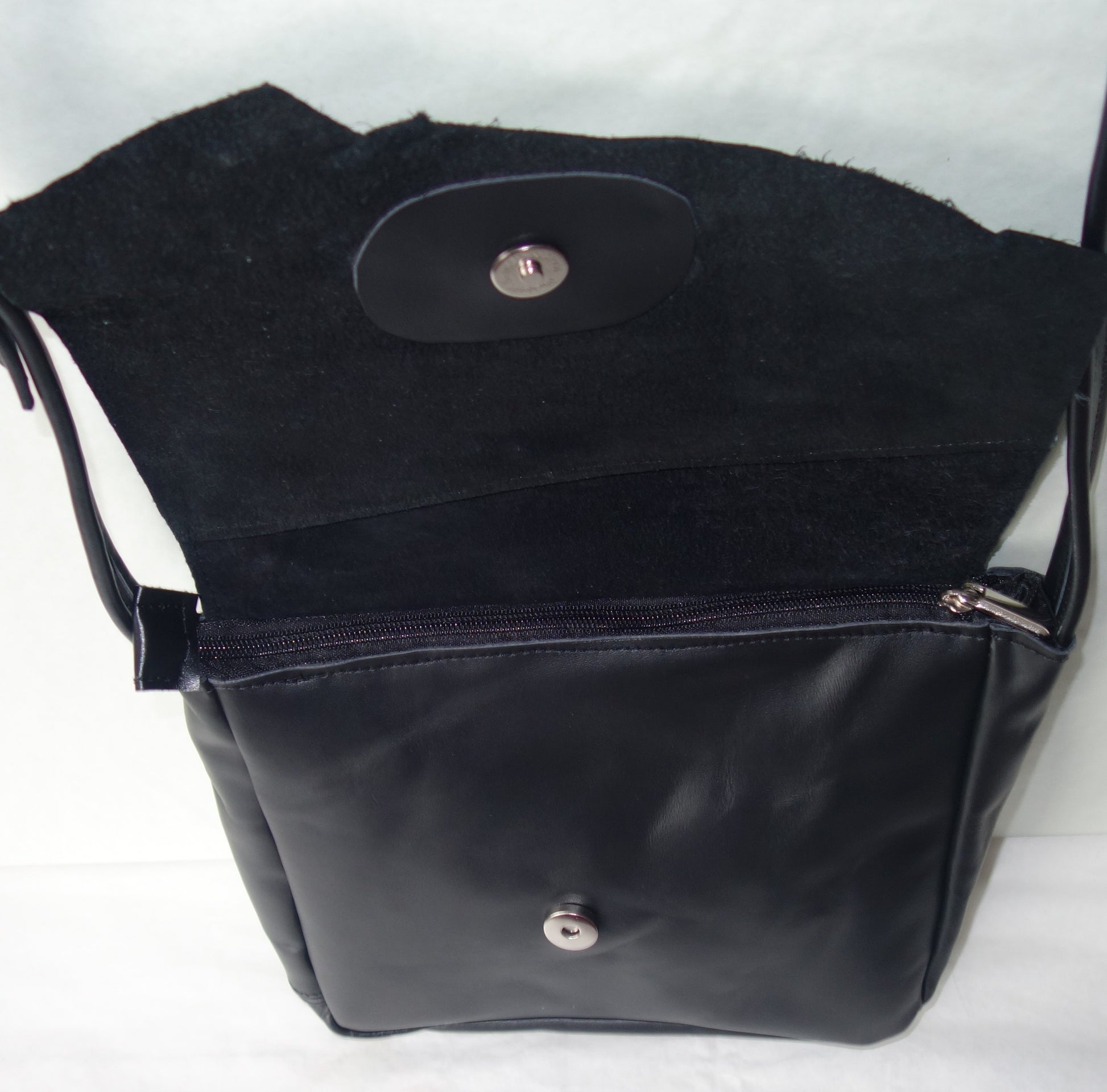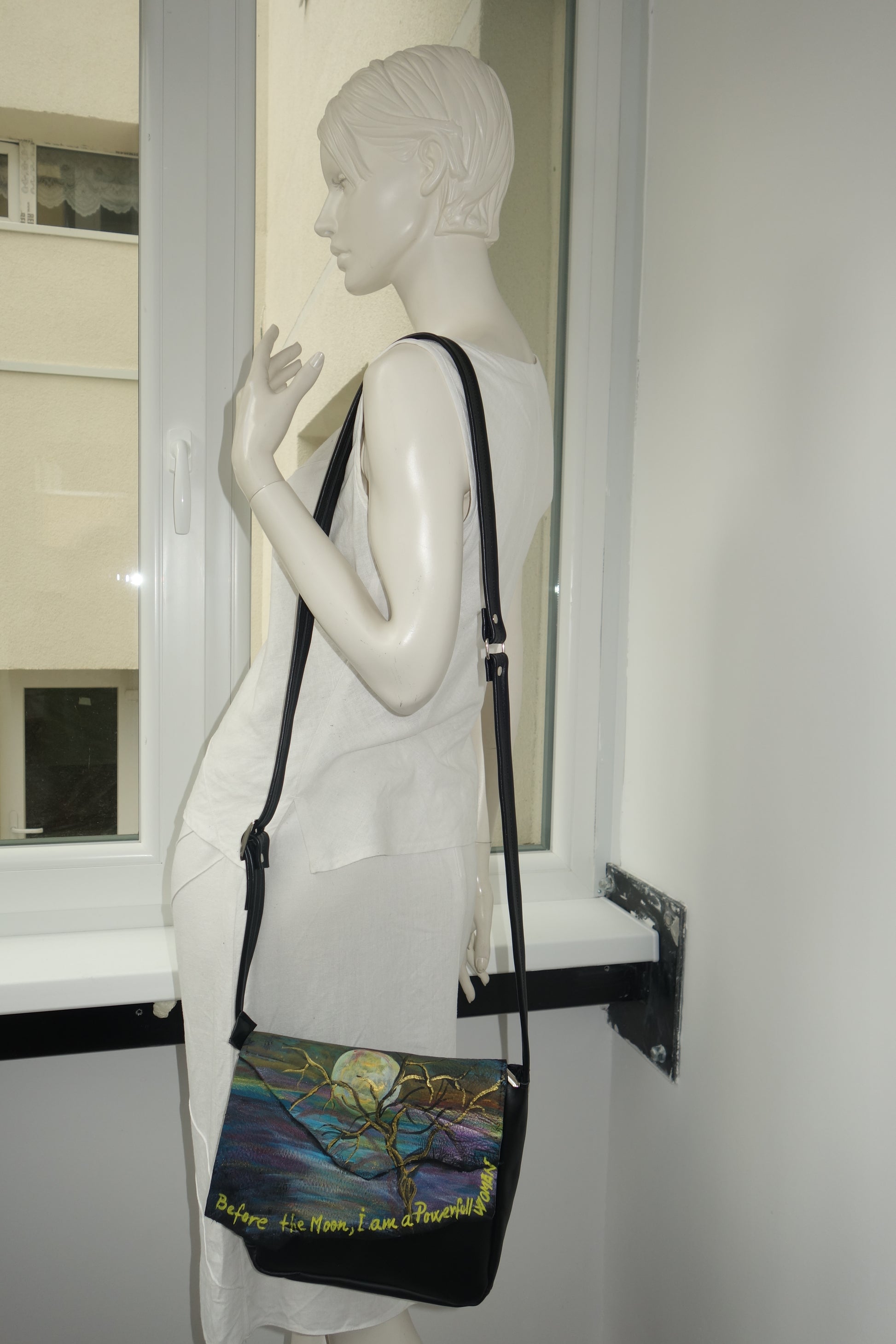 Geanta de piele naturala neagra, cu doua buzunare interioare dintre care unul cu fermoar, inchidere cu fermoar. Dimensiuni 22 cm latime sus , 20 cm inaltime , baza de 7 cm, bareta reglabila de 123 cm lungime. Pictata cu vopsele speciale pentru piele, rezistente la apa si in timp.