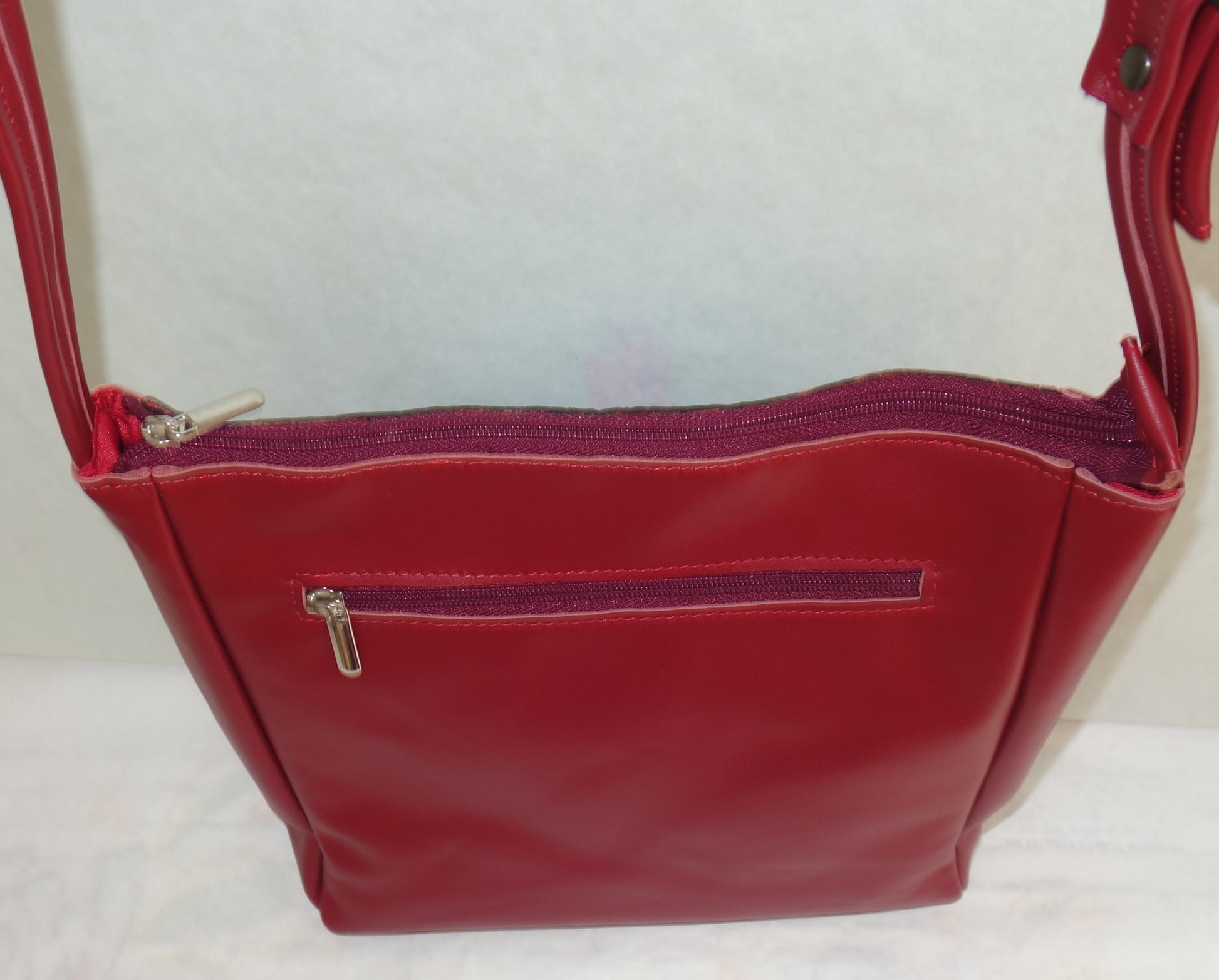 Geanta de piele naturala grena, cu doua buzunare interioare dintre care unul cu fermoar , inchidere cu fermoar. Dimensiuni 30 cm latime pe centru, 25 cm inaltime, baza de 7 cm, bareta de 123 cm lungime.