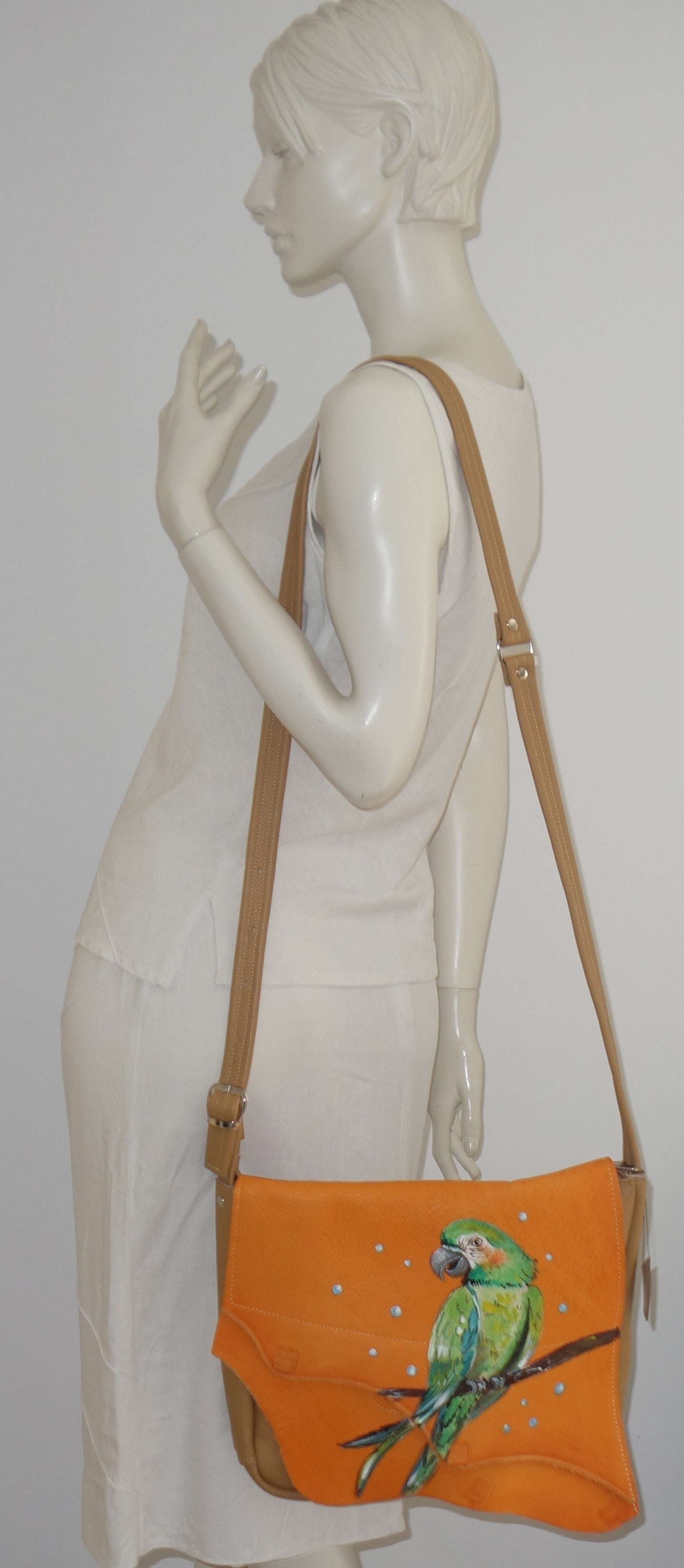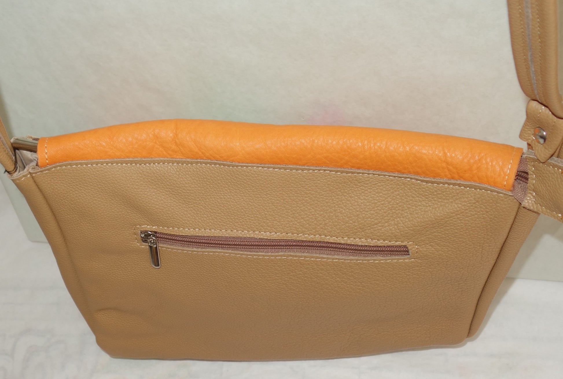 Geanta de piele naturala cappucino si orange, pictata cu vopsele speciale pentru piele, captusita si cu doua buzunare interioare dintre care unul cu fermoar, inchidere cu capsa magnetica. Dimensiuni : 30 cm latime , 25 cm inaltime ,baza de 7 cm, bareta dublata si reglabila de 124 cm lungime , fermoar exterior pe spate .