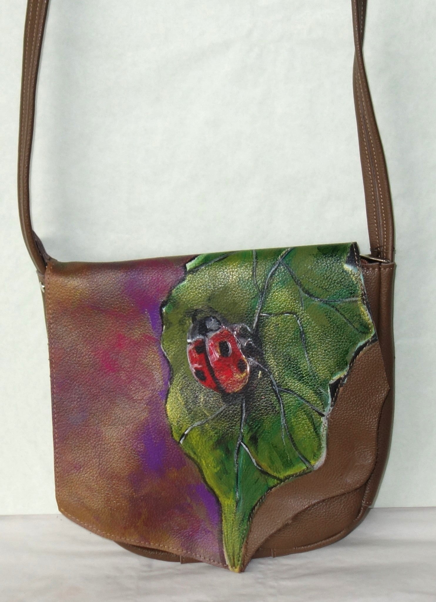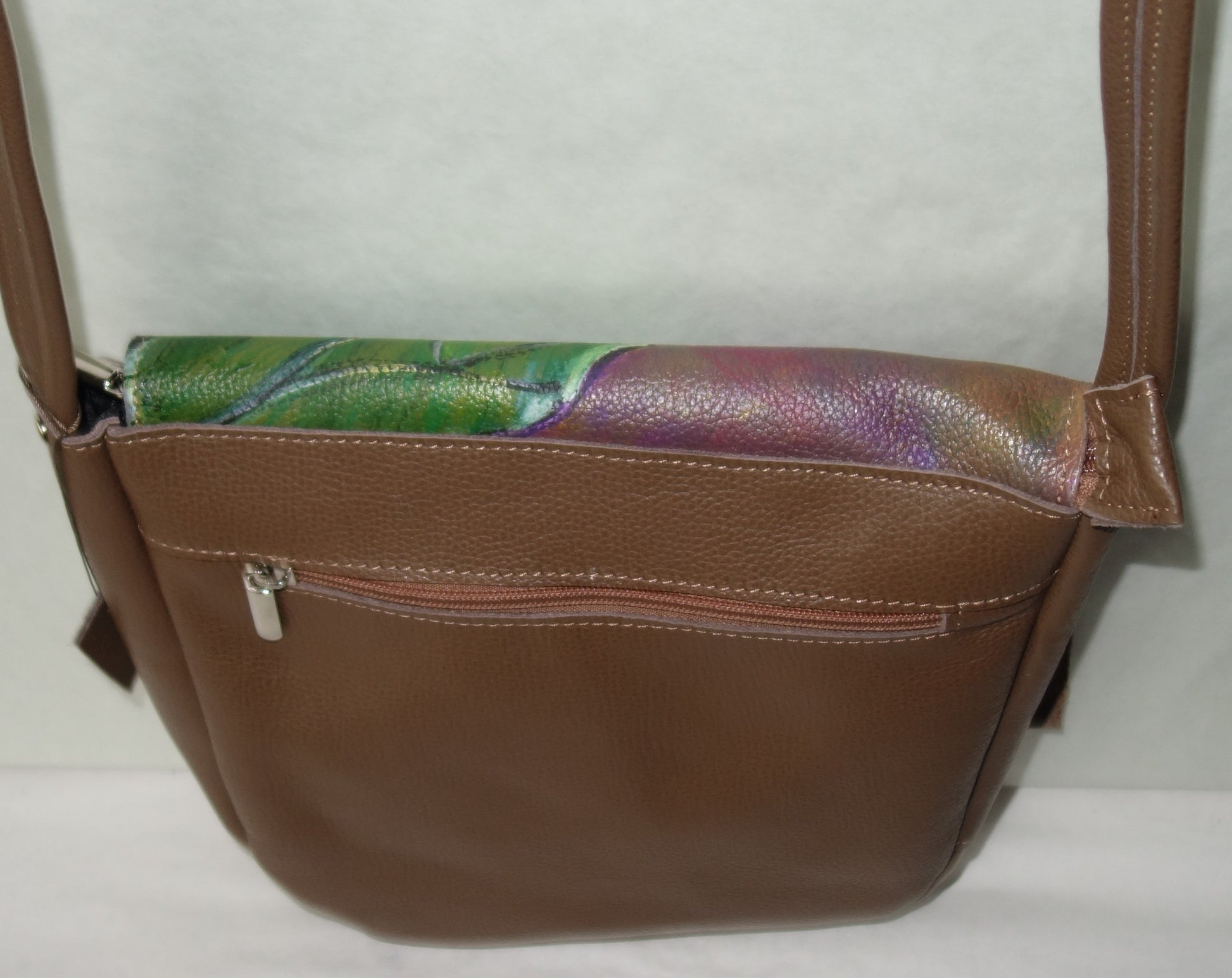 Geanta de piele naturala maro ,cu doua buzunare interioare inchidere cu fermoar . Dimensiuni 233 cm latime pe centru , 23 cm inaltime , baza de 7 cm , bareta de 123 cm lungime . Pictata cu vopsele speciale pentru piele.