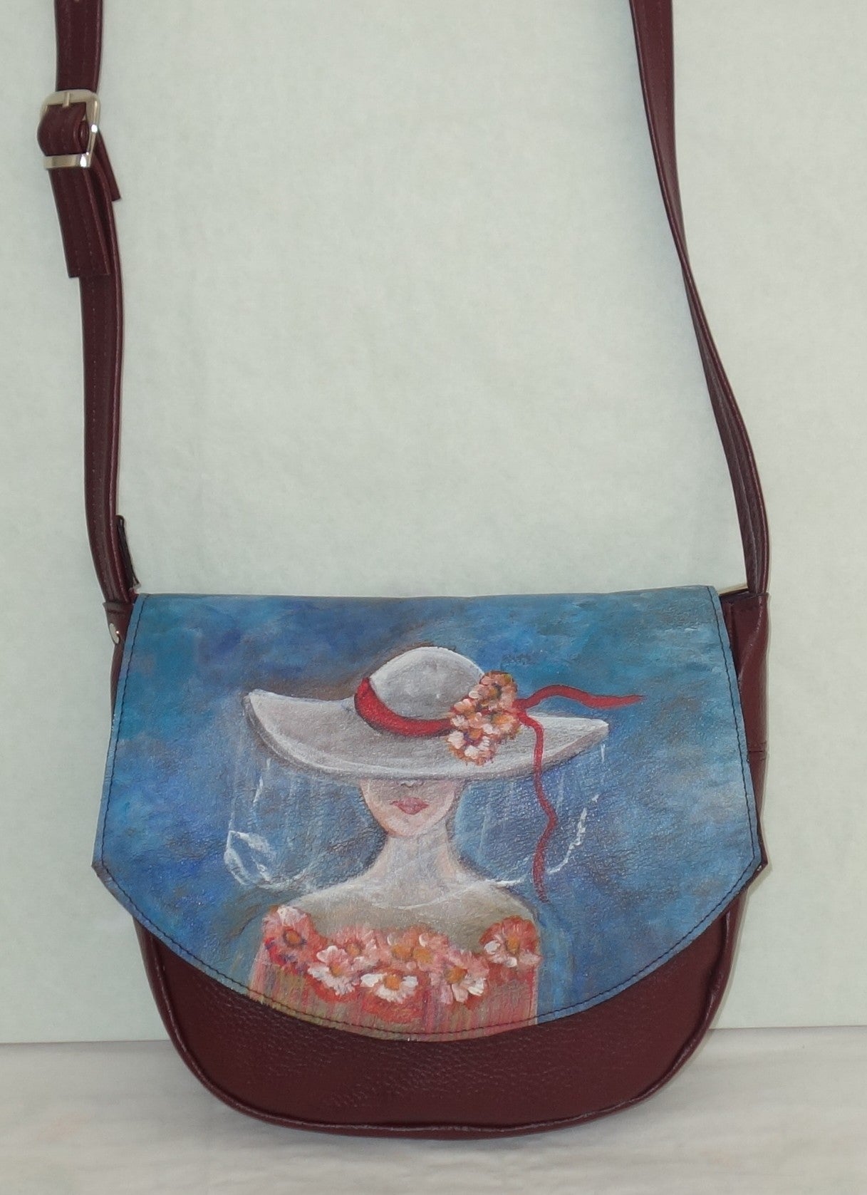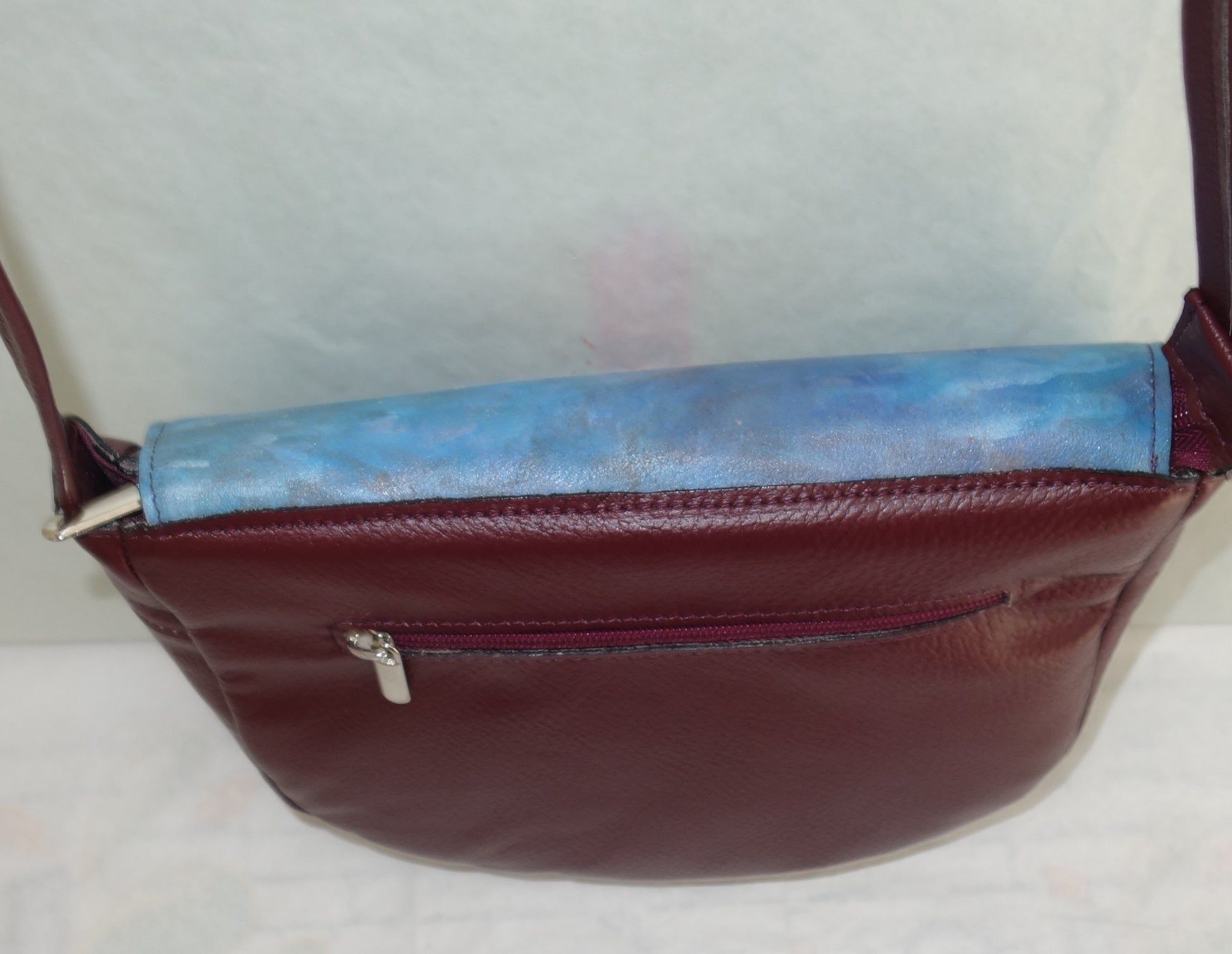 Geanta de piele naturala visinie si bleumarin, cu doua buzunare interioare dintre care unul cu fermoar , inchidere cu fermoar. Dimensiuni 26 cm latime pe centru , 22 cm inaltime , baza de 8 cm , bareta reglabila de 125 cm lungime .