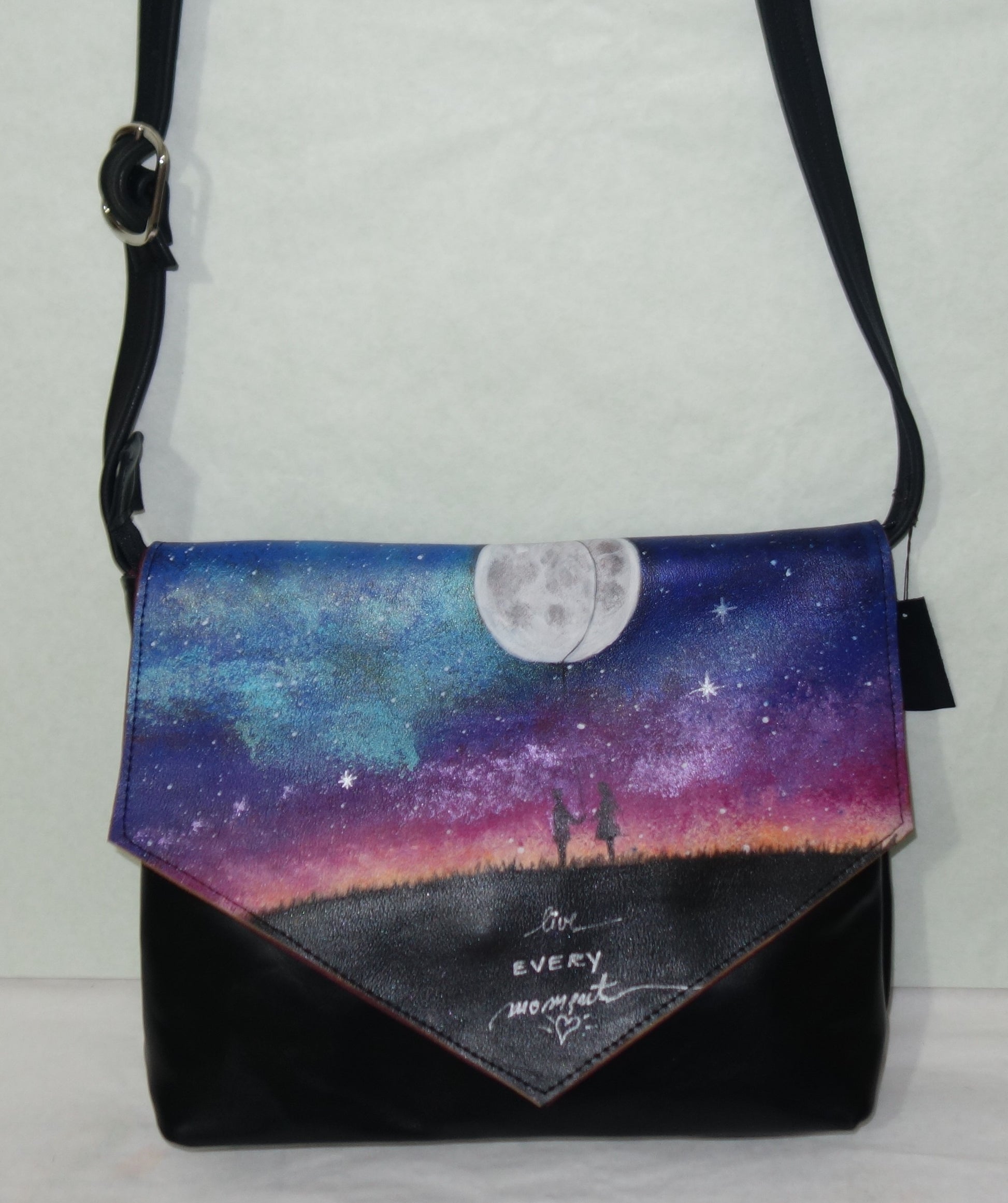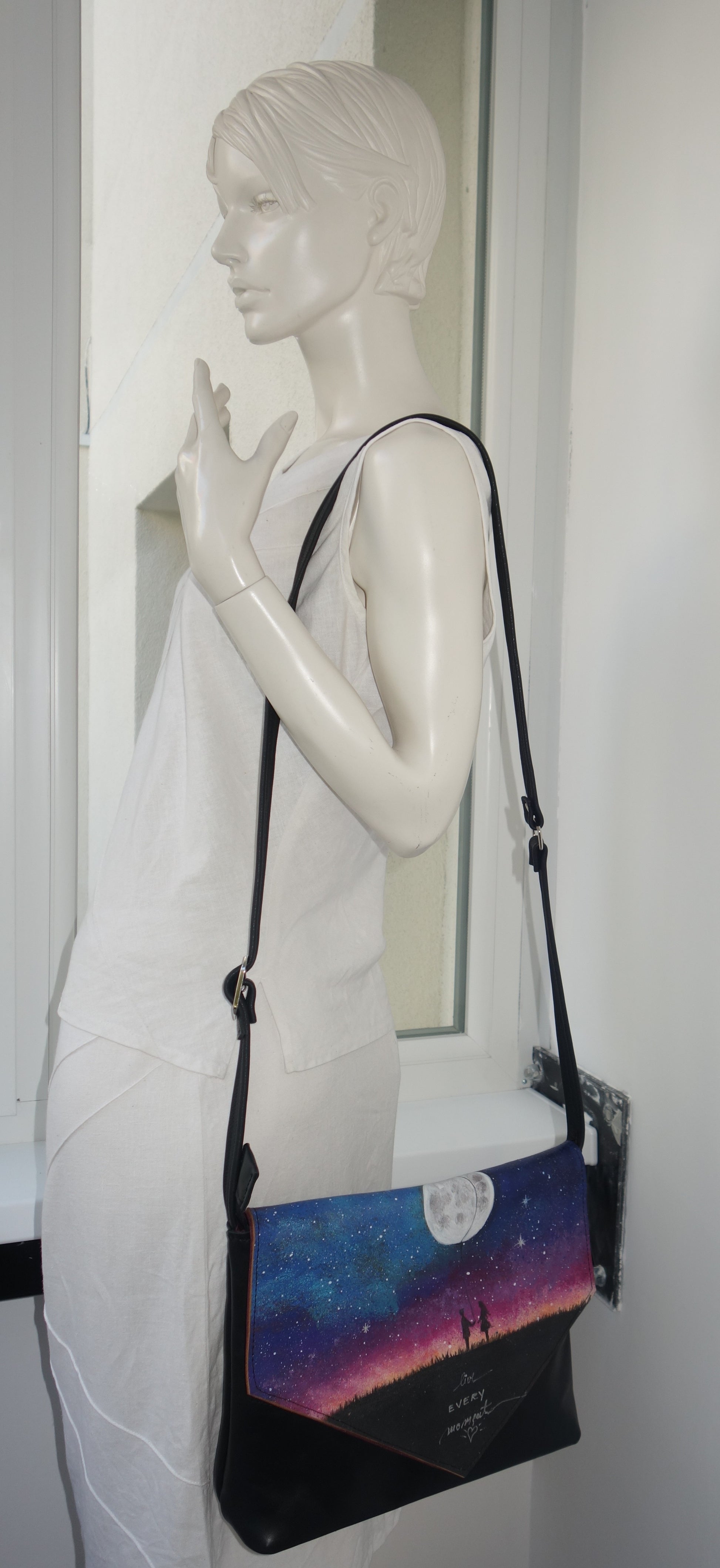 Geanta de piele naturala neagra , cu doua buzunare interioare dintre care unul cu fermoar, inchidere cu fermoar. Dimensiuni 33 cm latime pe centru , 23 cm inaltime , baza de 7 cm, bareta reglabila de 123 cm lungime. Pictata cu vopsele speciale pentru piele, rezistente la apa si in timp.