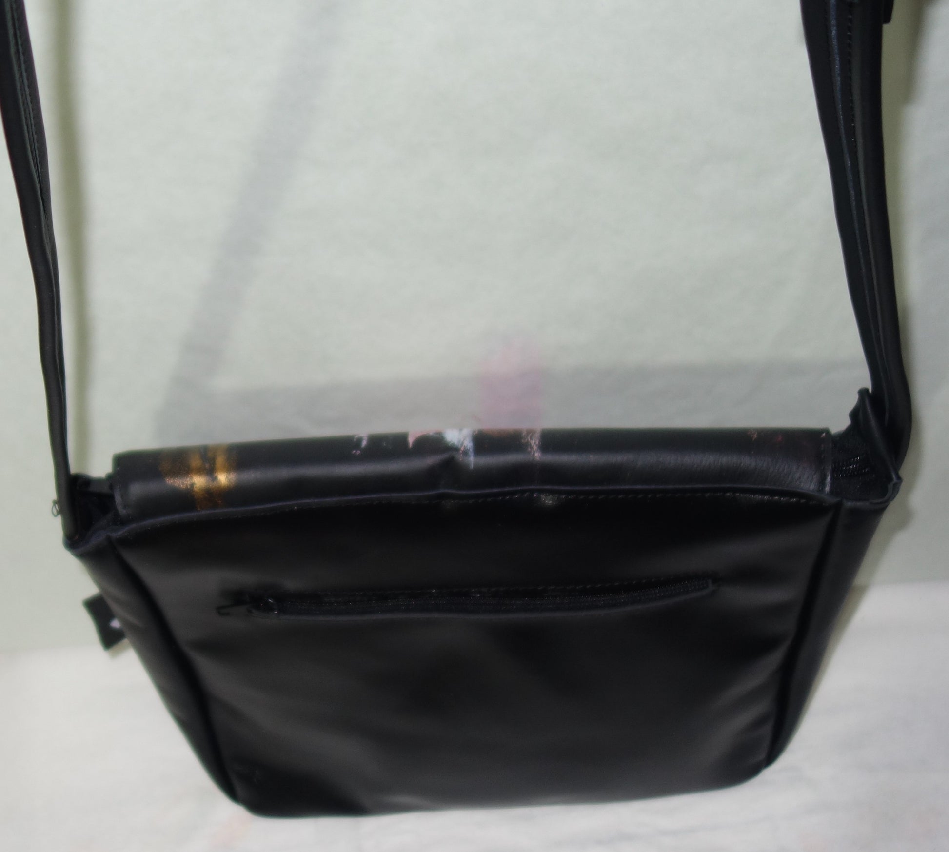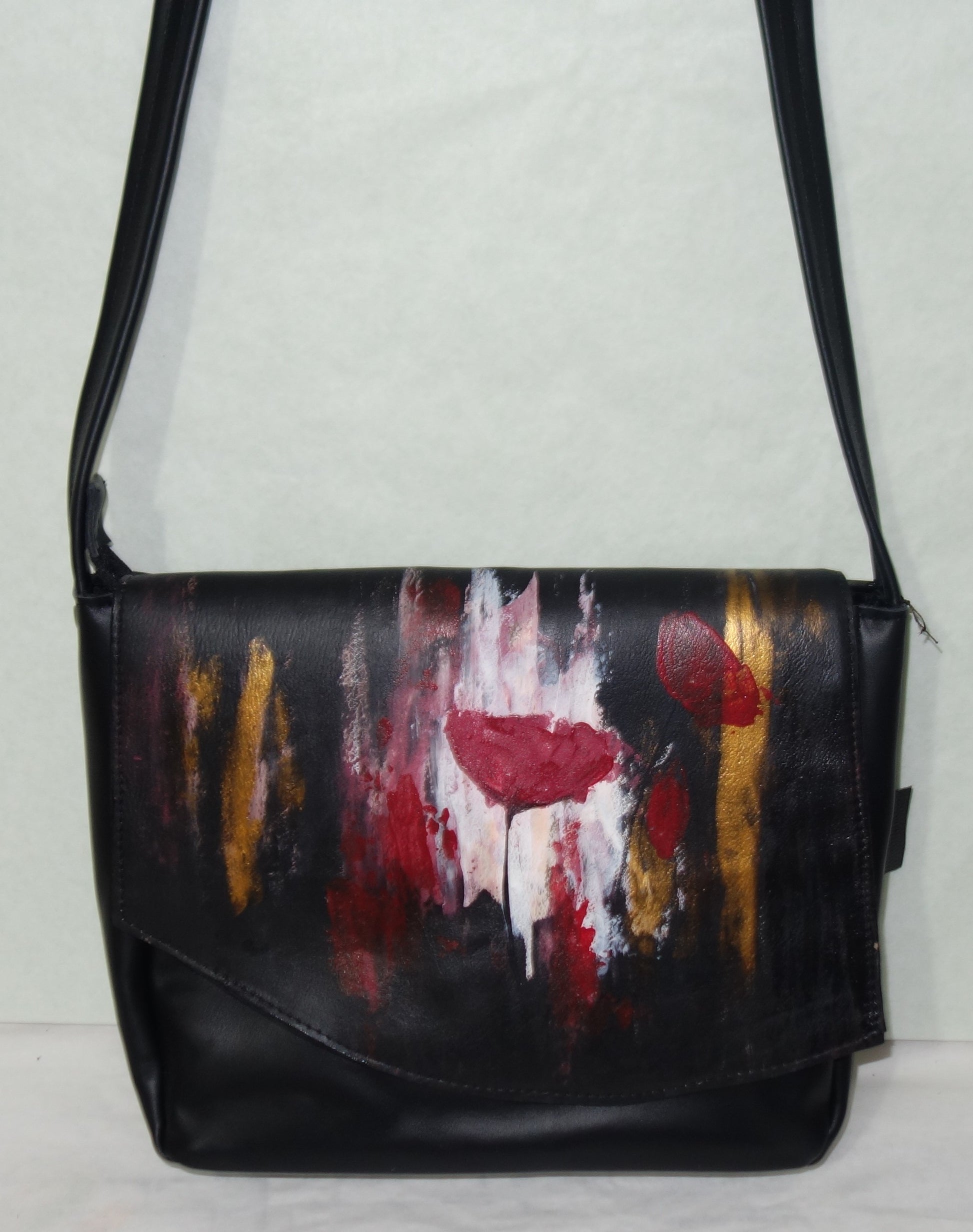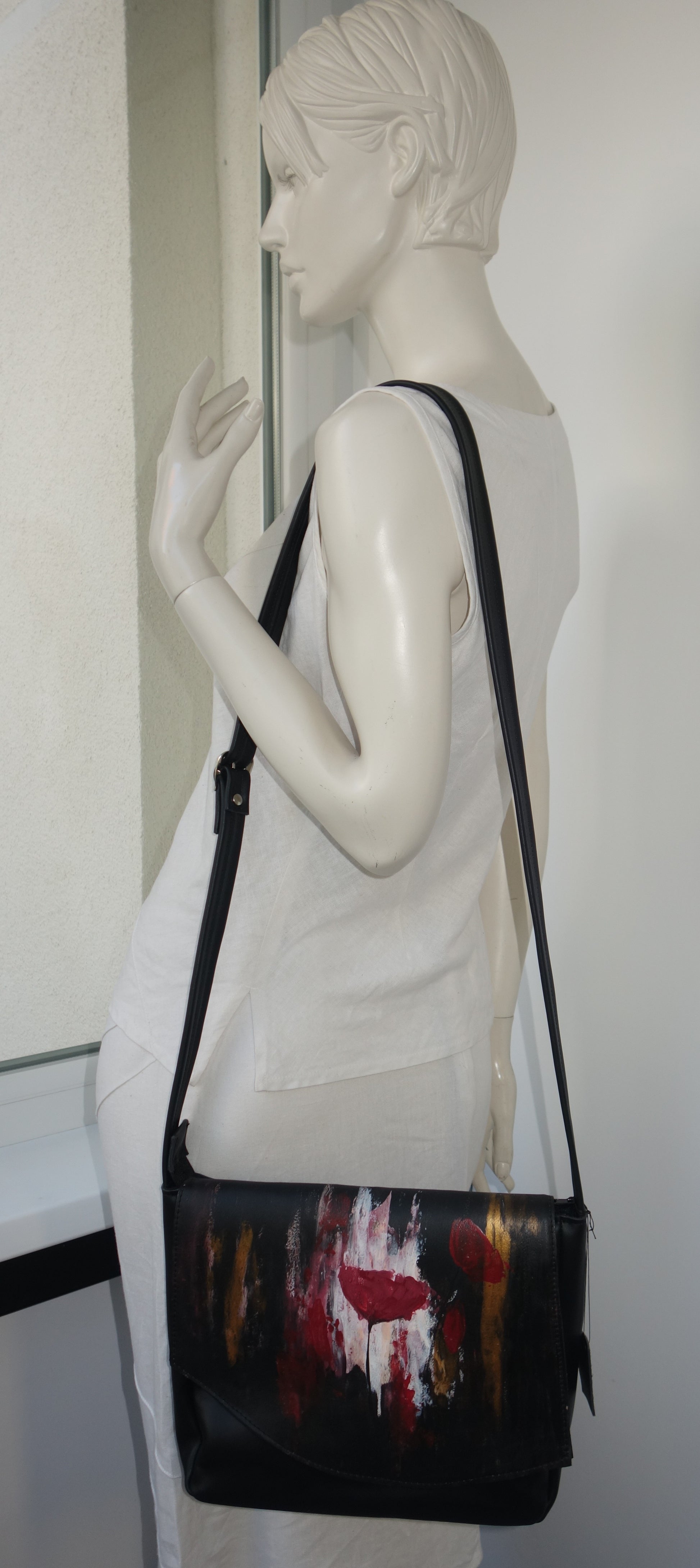 Geanta de piele naturala neagra ,cu doua buzunare interioare inchidere cu fermoar si capsa magnetica . Dimensiuni 28 cm latime , 23 cm inaltime , baza de 7 cm , bareta reglabila de 125 cm lungime . Pictata cu vopsele speciale pentru piele, rezistente la apa si in timp.
