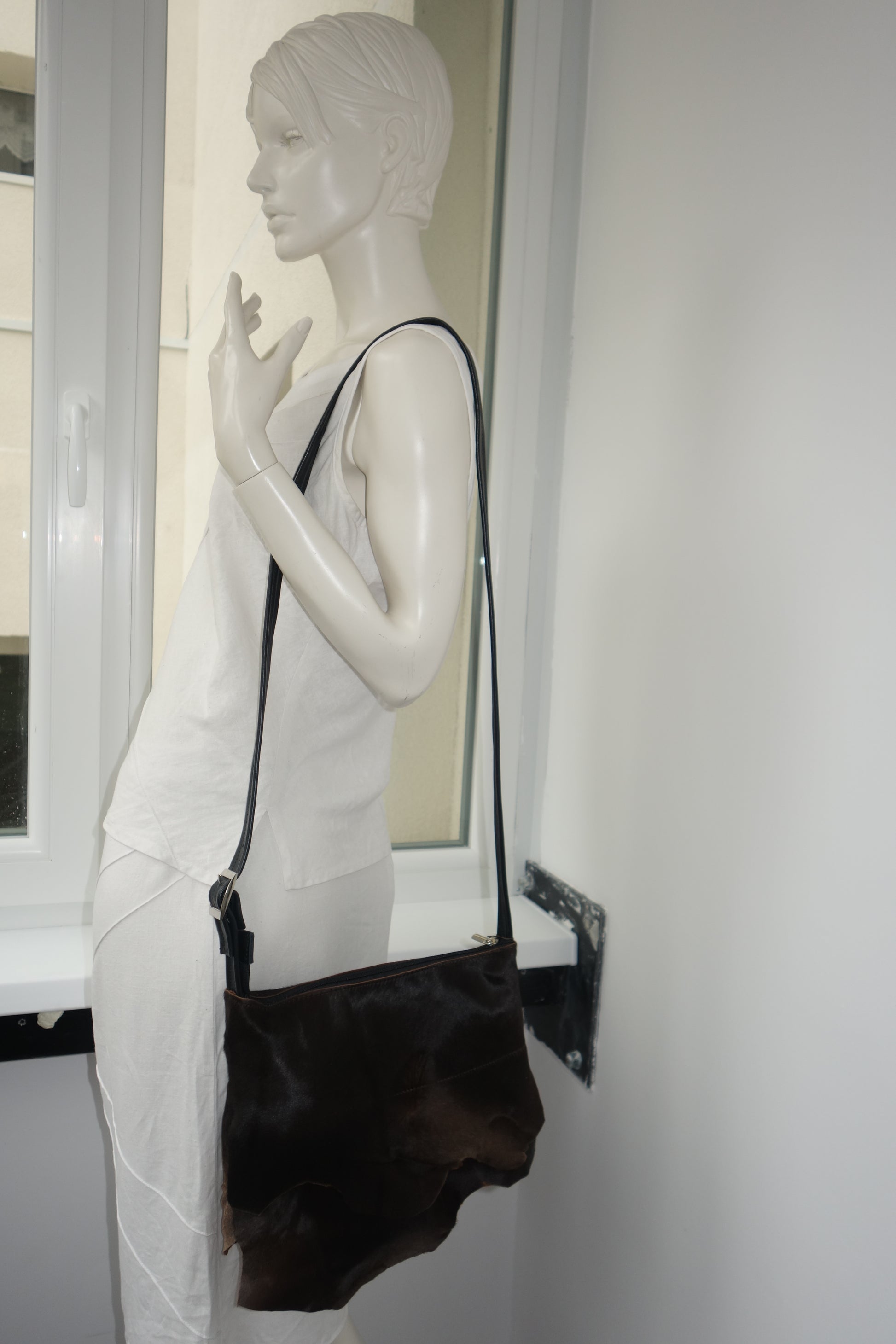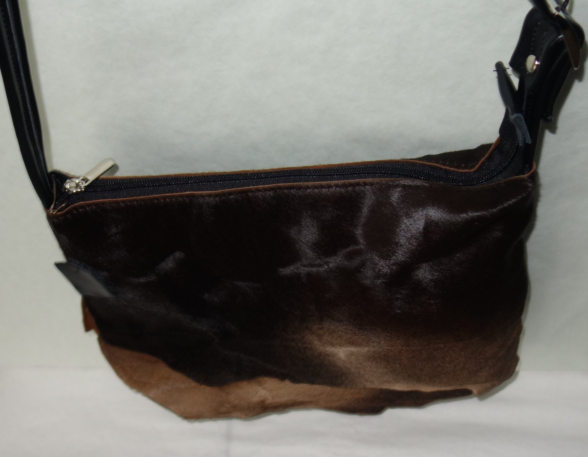 Geanta de piele naturala si blanita naturala, cu doua buzunare interioare dintre care unul cu fermoar, inchidere cu fermoar. Dimensiuni 29 cm latime pe centru , 21 cm inaltime , baza de 7 cm, bareta reglabila de 125 cm lungime.