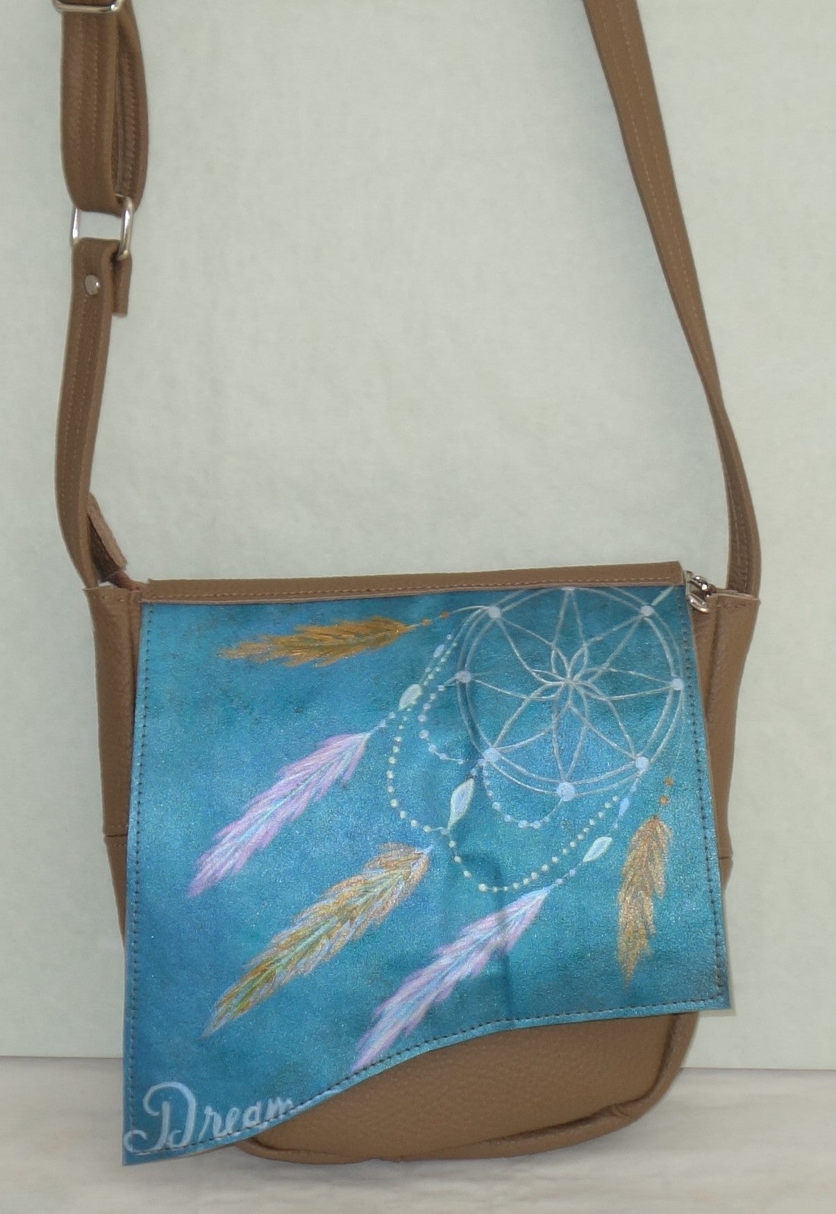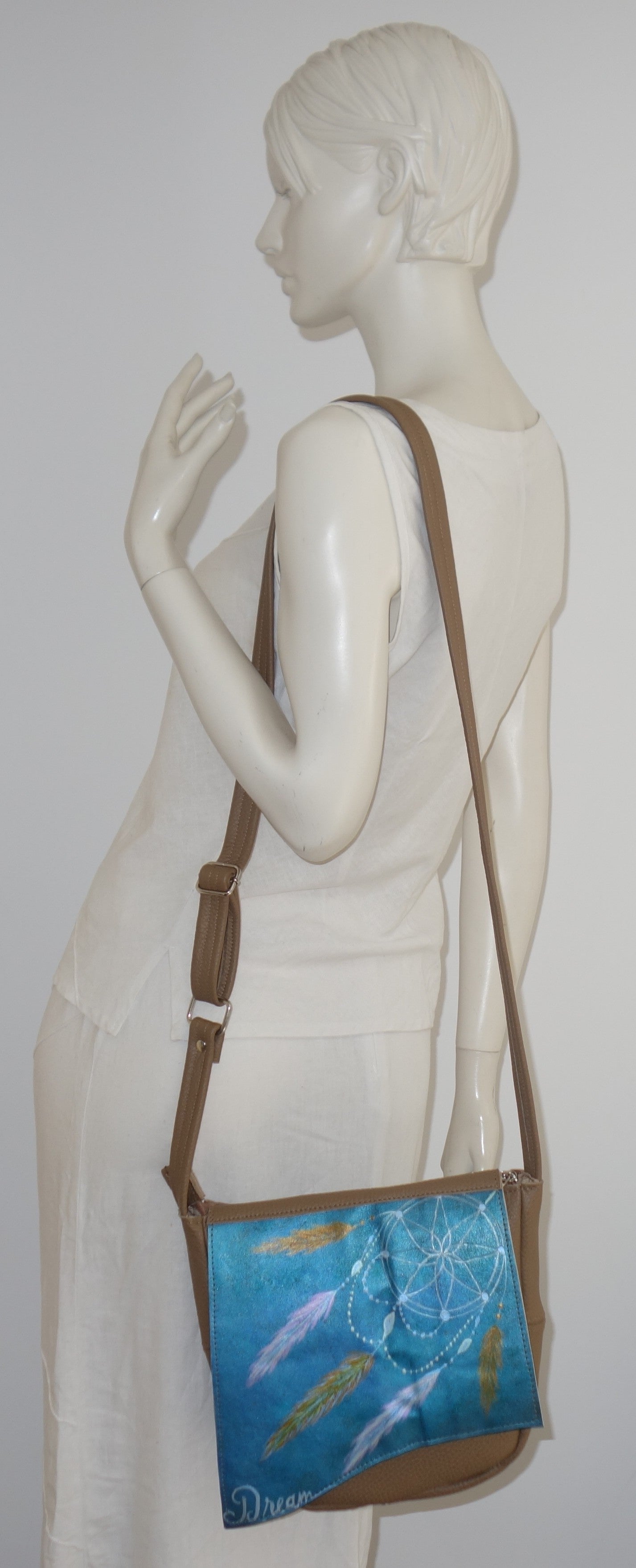 Geanta de piele naturala maronie si turcoaz, cu doua buzunare interioare dintre care unul cu fermoar, inchidere cu fermoar si capsa magnetica. Dimensiuni 23 cm latime pe centru , 23 cm inaltime , baza de 7 cm, bareta de 128 cm lungime. Pictata cu vopsele speciale pentru piele.