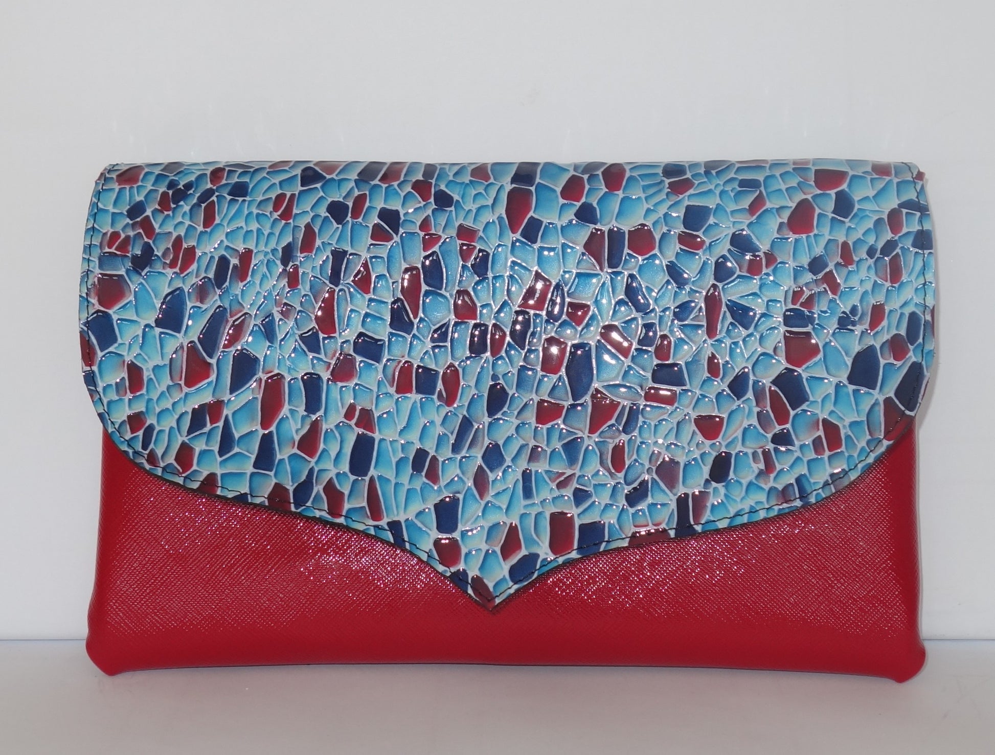 Plic de piele naturala rosie saffiano si piele cu imprimeu , dimensiuni 28 x 17 cm. Captusit, cu un buzunar interior, se inchide cu capsa magnetica.