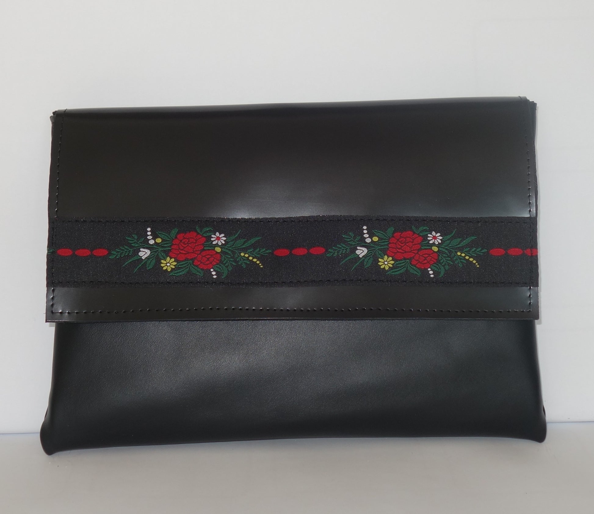Plic de piele naturala neagra si piele lacuita , dimensiuni 29 x 20 cm . Captusit , cu un buzunar interior , se inchide cu capsa magnetic ,aplicatie banda tesuta.