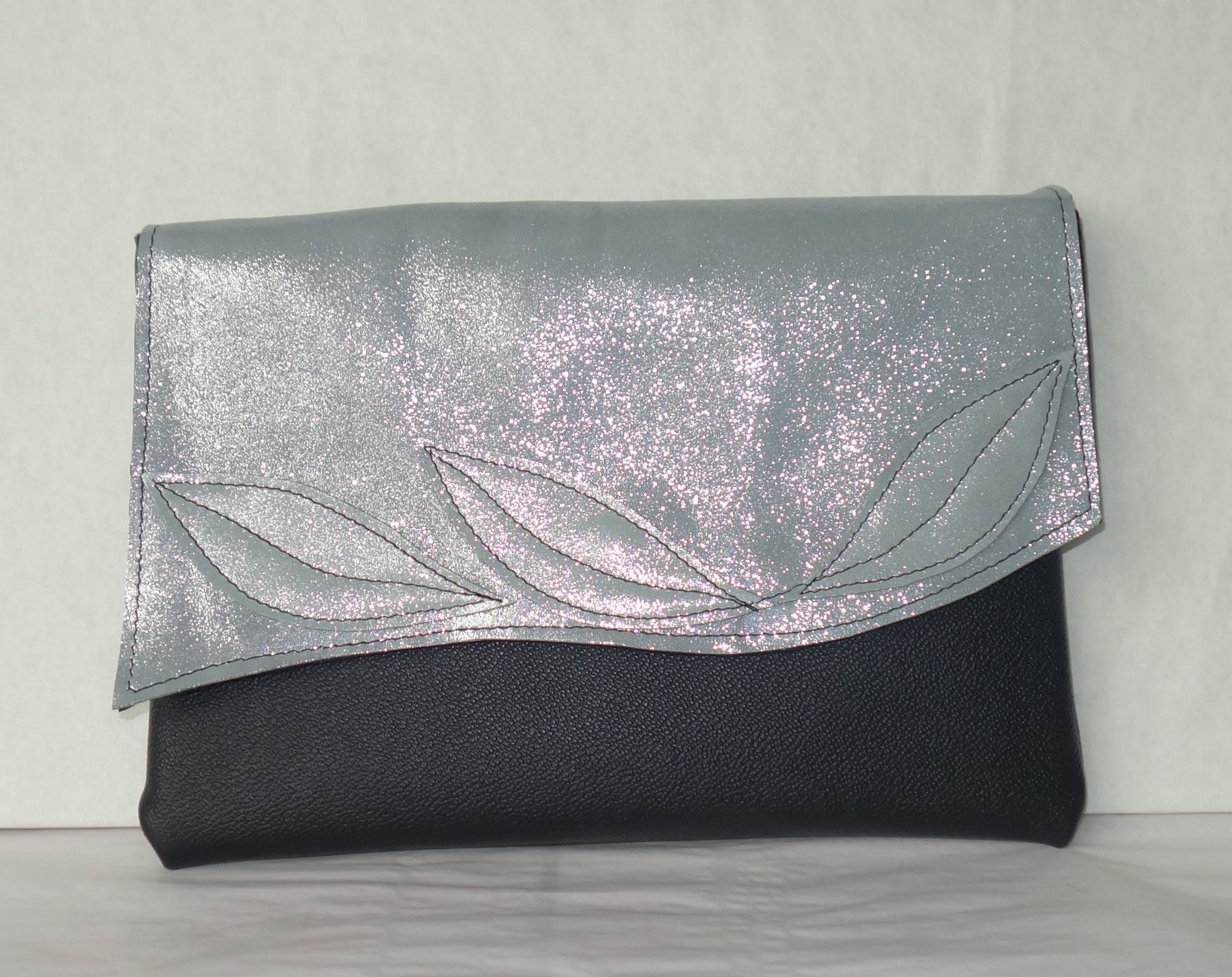 Plic de piele naturala neagra si vernil deschis sidefat, de dimensiuni 18 x 29 cm . Captusit ,cu un buzunar interior , se inchide cu capsa magnetica.