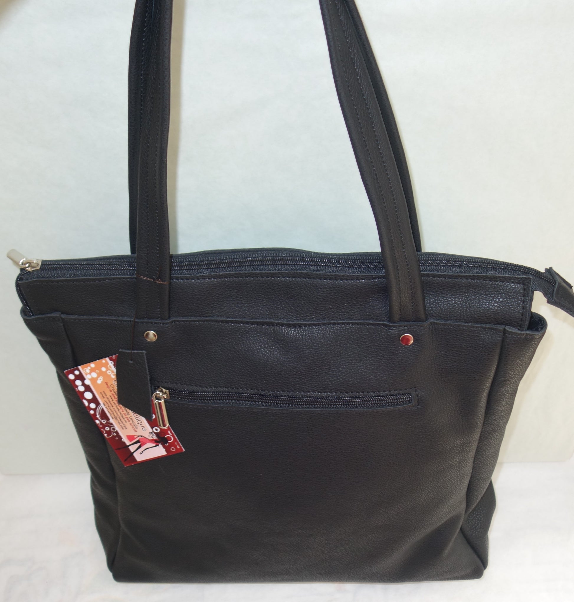 Poseta de piele naturala neagra, pictata cu vopsele speciale pentru piele, de dimensiuni 37 cm latime, 30 cm inaltime , baza de 10 cm, fund intarit. Manere de 60 cm lungime. Captusita, cu doua buzunare interioare, se inchide cu fermoar. Fermoar exterior pe spate.
