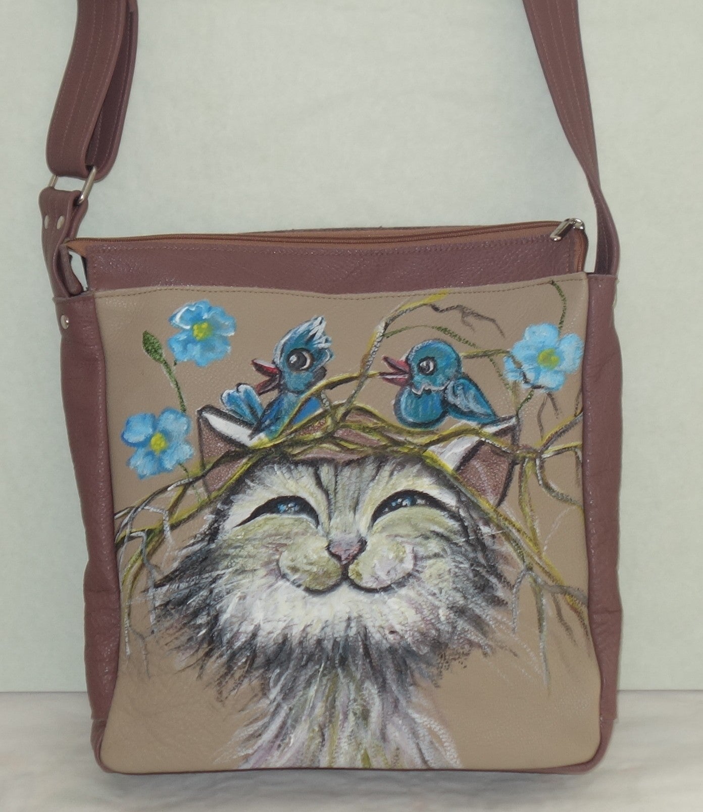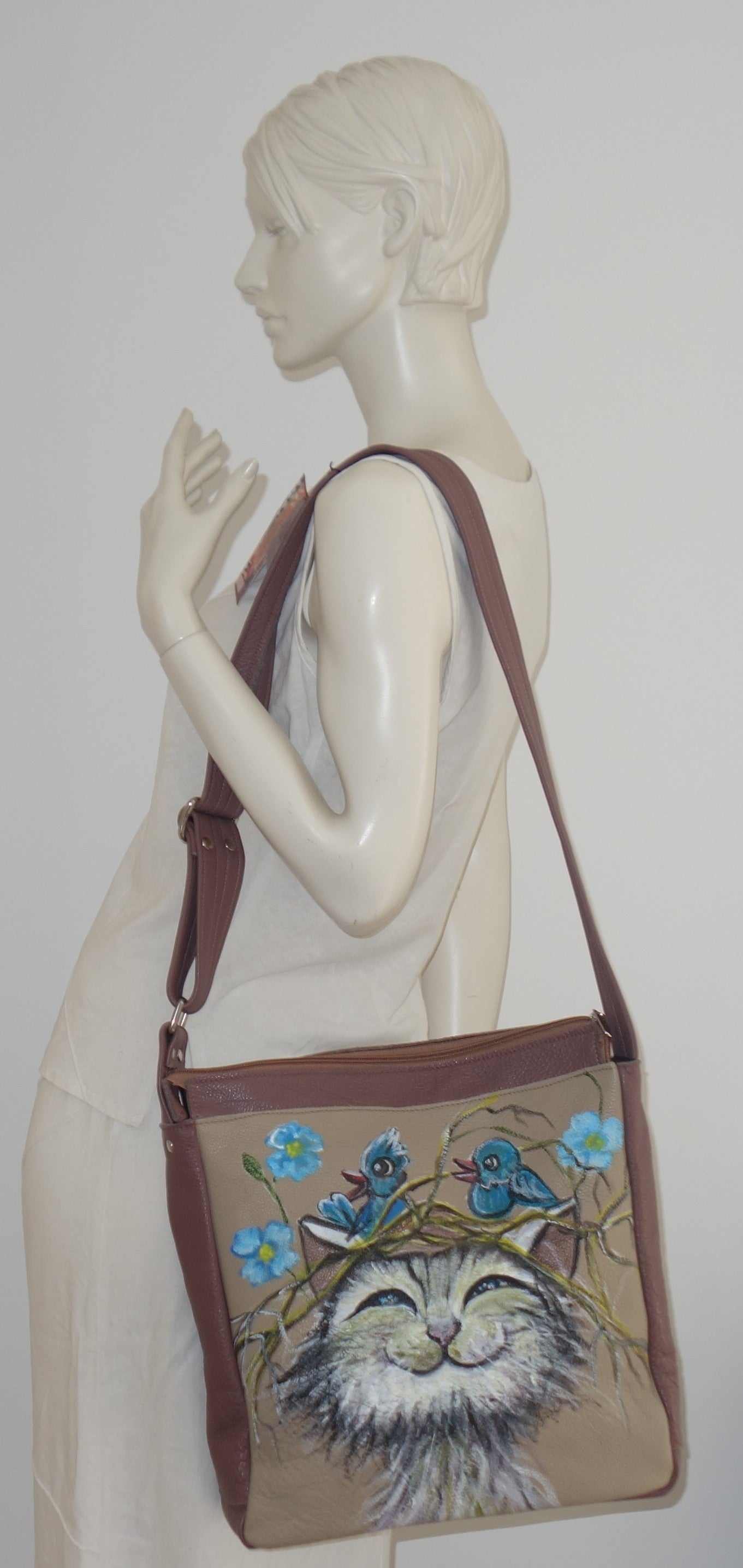 Poseta de piele naturala bej si cacao cu lapte ,pictata manual cu vopsele speciale pentru piele, dimensiuni 32 cm latime sus, 30 cm inaltime, baza de 8 cm . Captusita, cu doua buzunare interioare, se inchide cu fermoar. Fermoar exterior pe spatele posetei. Se poate purta ca geanta, dar si ca poseta.