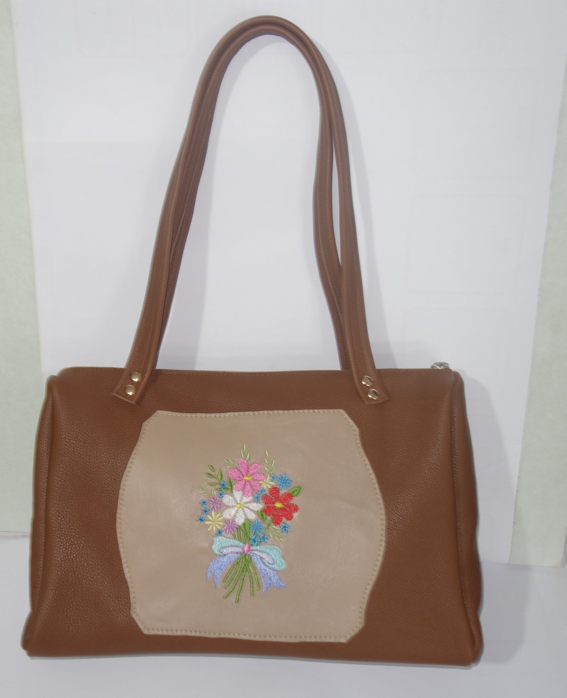 Poseta de piele naturala maro cu broderie inflorata , dimensiuni 33 cm latime pe centru , 29 cm inaltime, baza de 12 cm si bareta de 66 cm. Captusita, cu doua buzunare interioare, se inchide cu fermoar. Fermoar exterior pe spatele posetei.