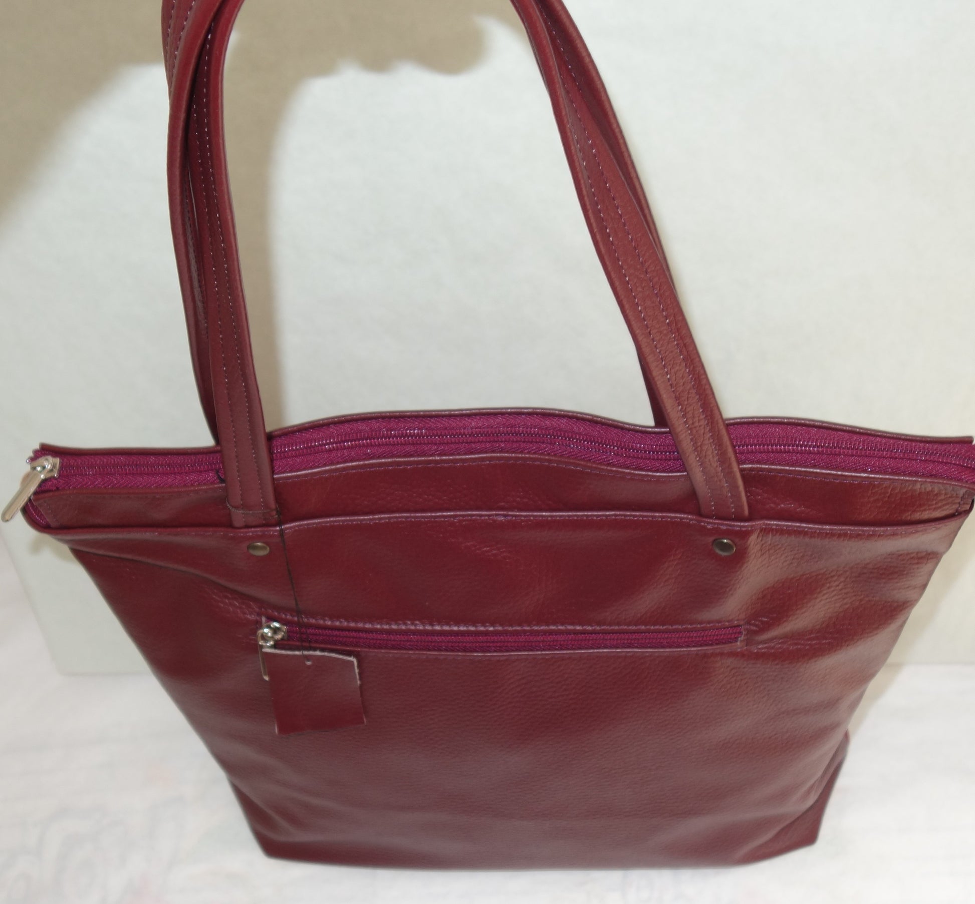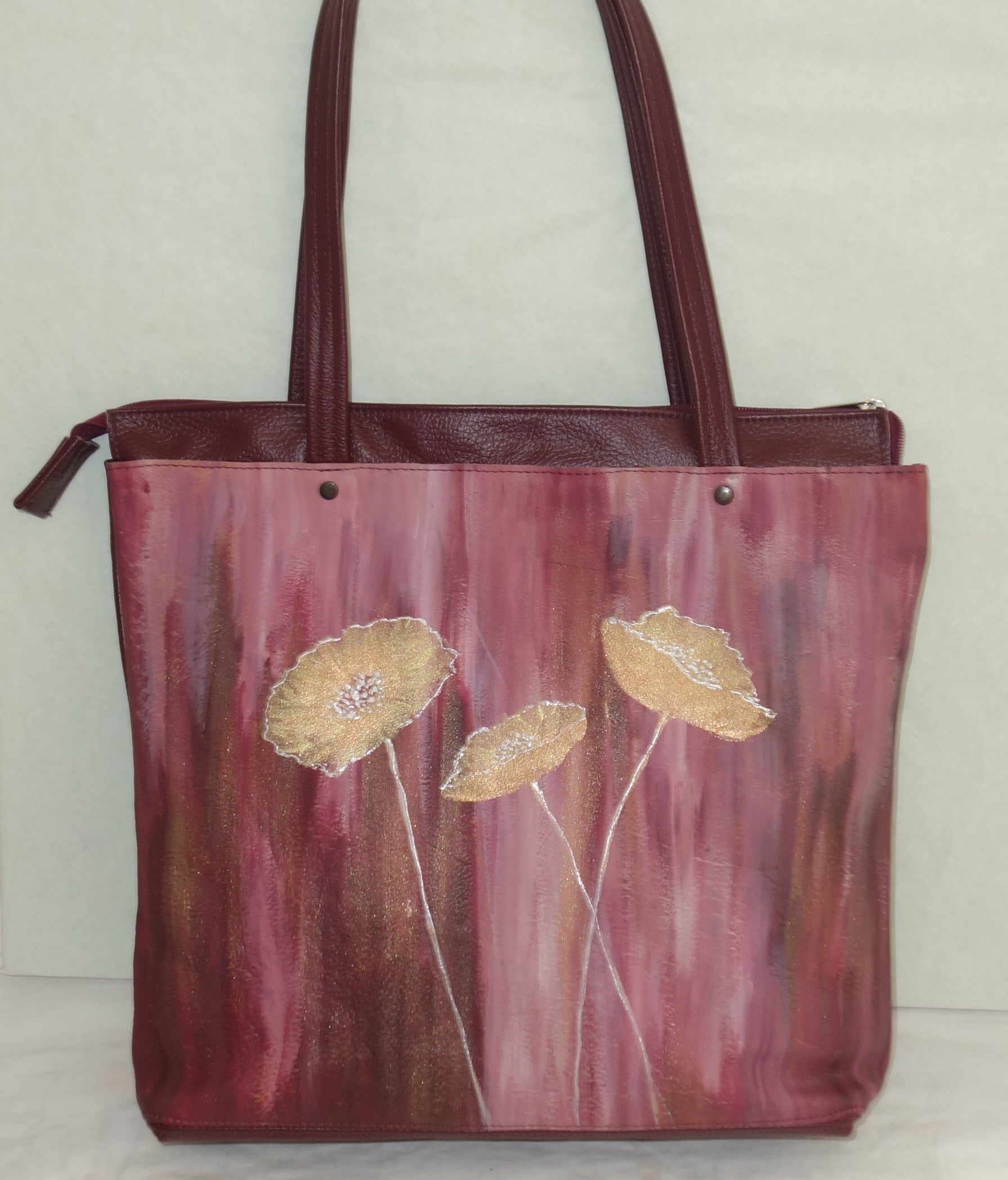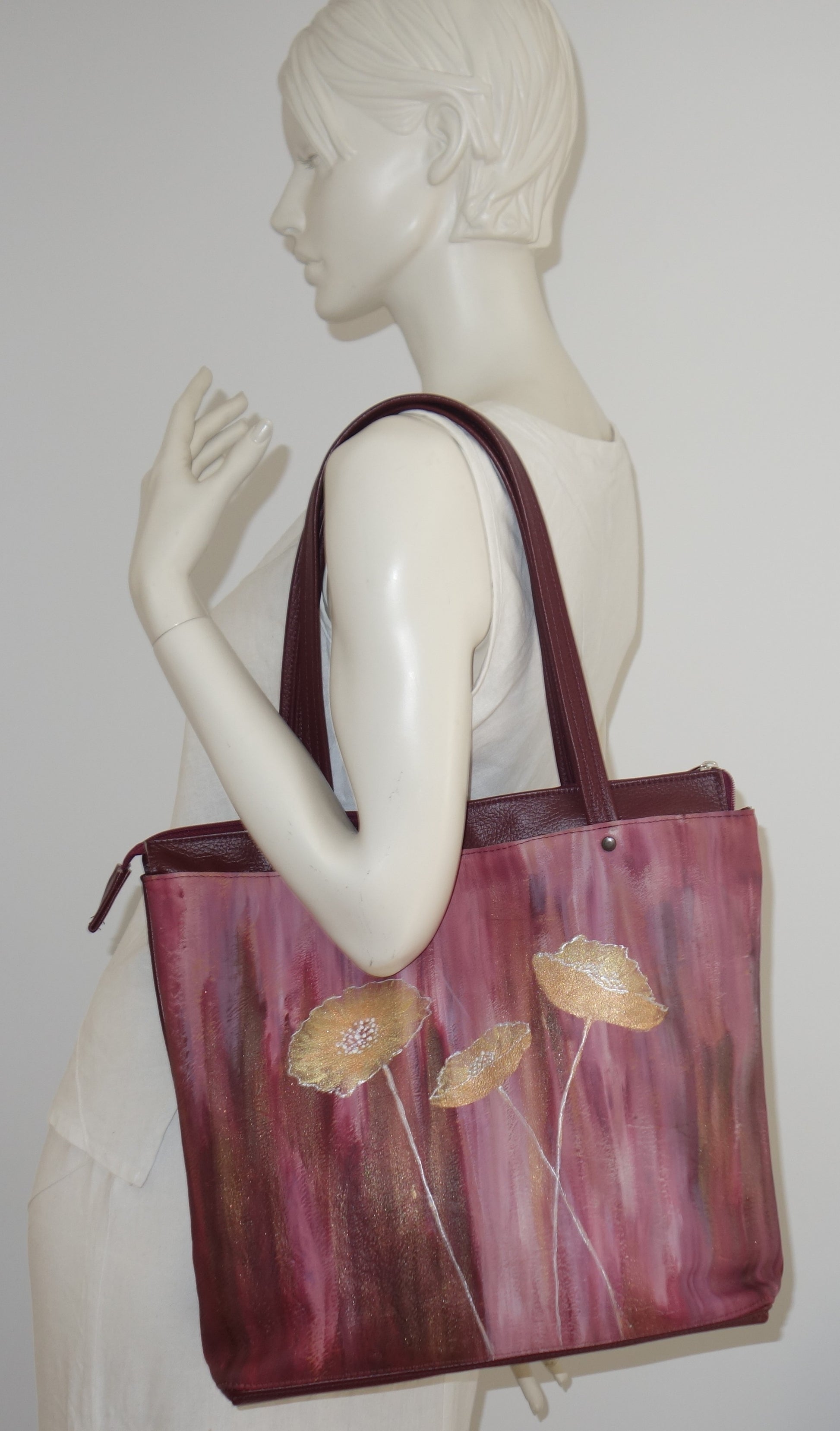 Poseta de piele naturala visinie, pictata manual cu vopsele de piele rezistente la apa si in timp, dimensiuni 40 cm latime sus, 30 cm inaltime, baza de 10 cm. Bareta de umar de 60 cm.. Captusita , cu doua buzunare interioare , se inchide cu fermoar. Fermoar exterior pe spatele posetei.