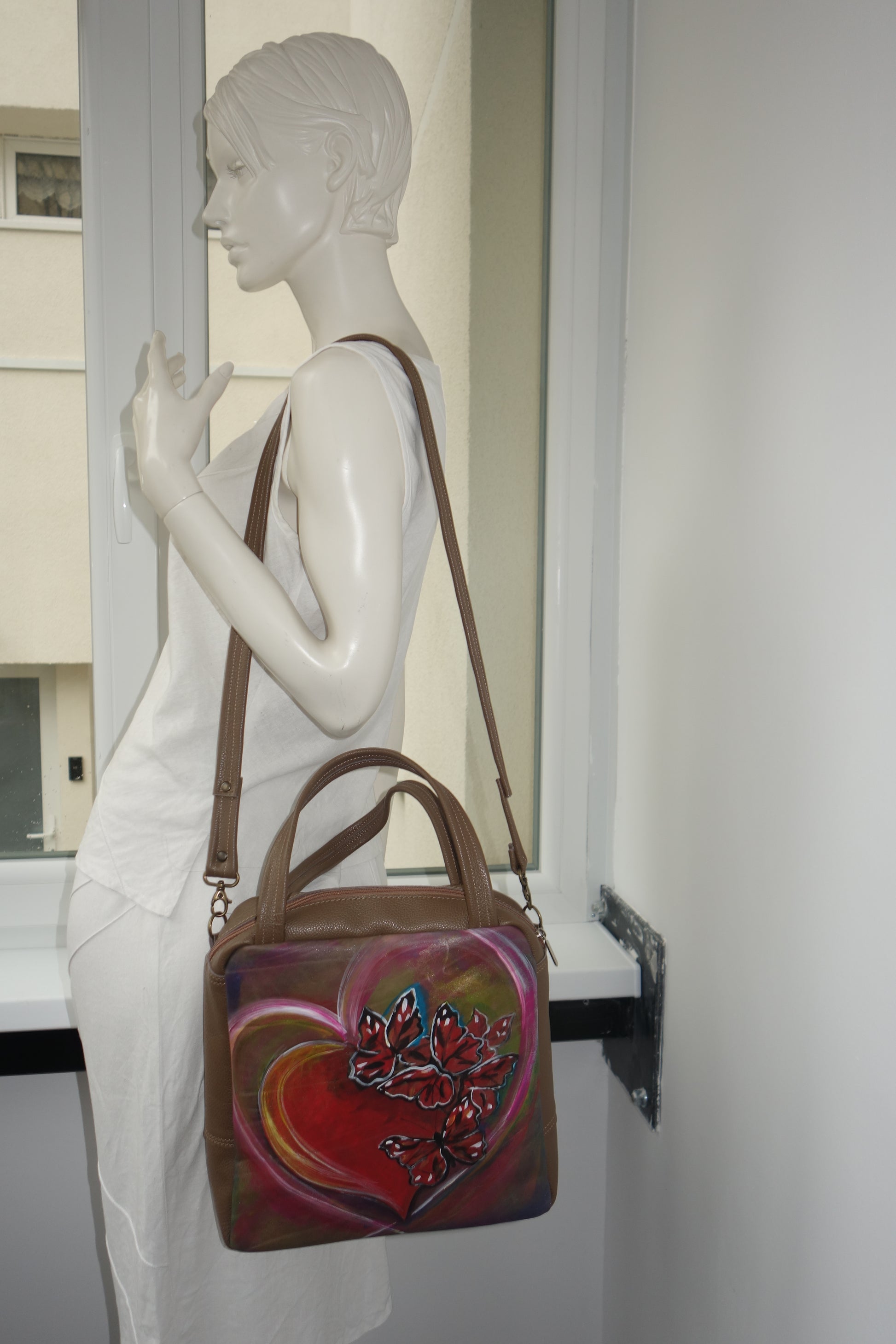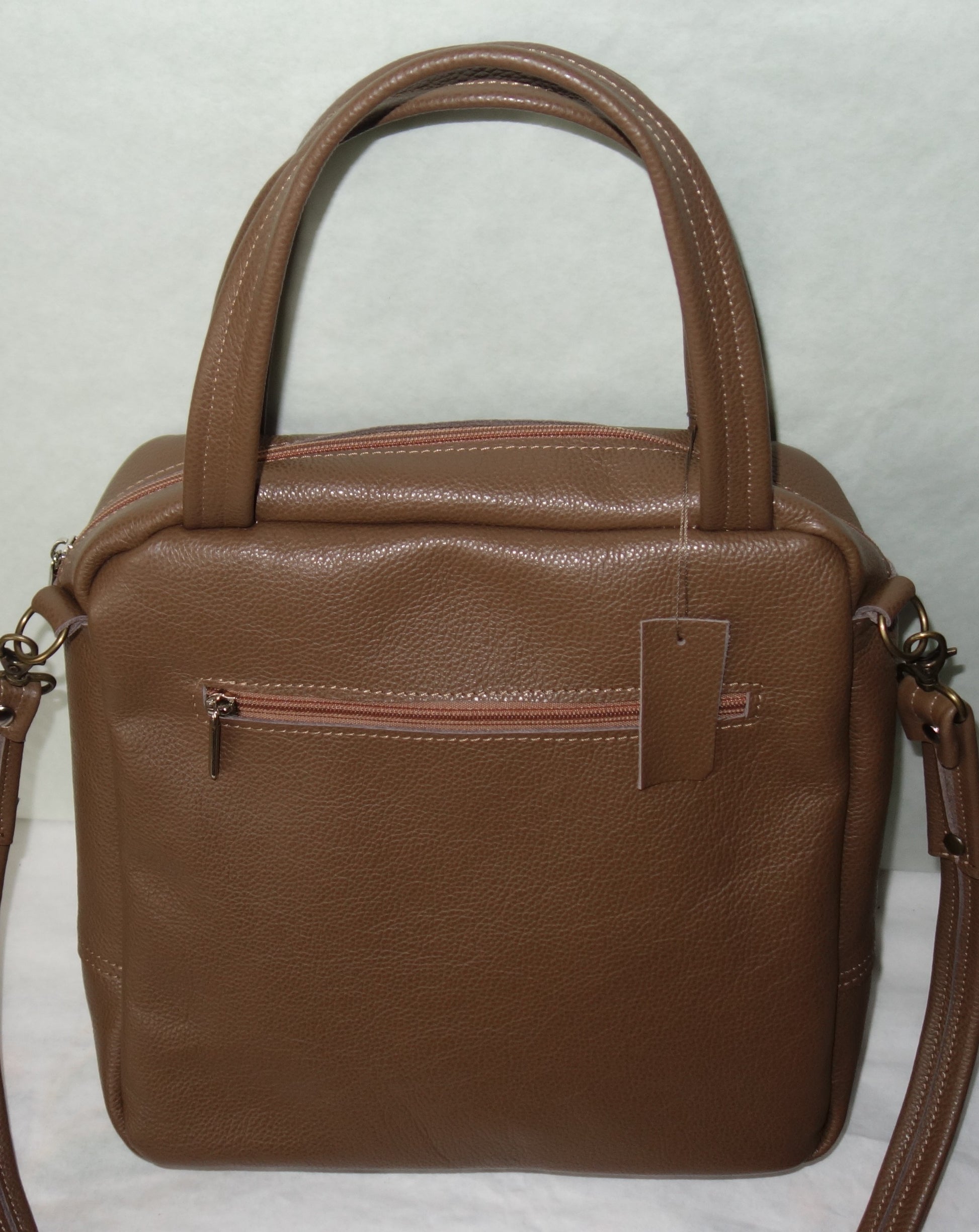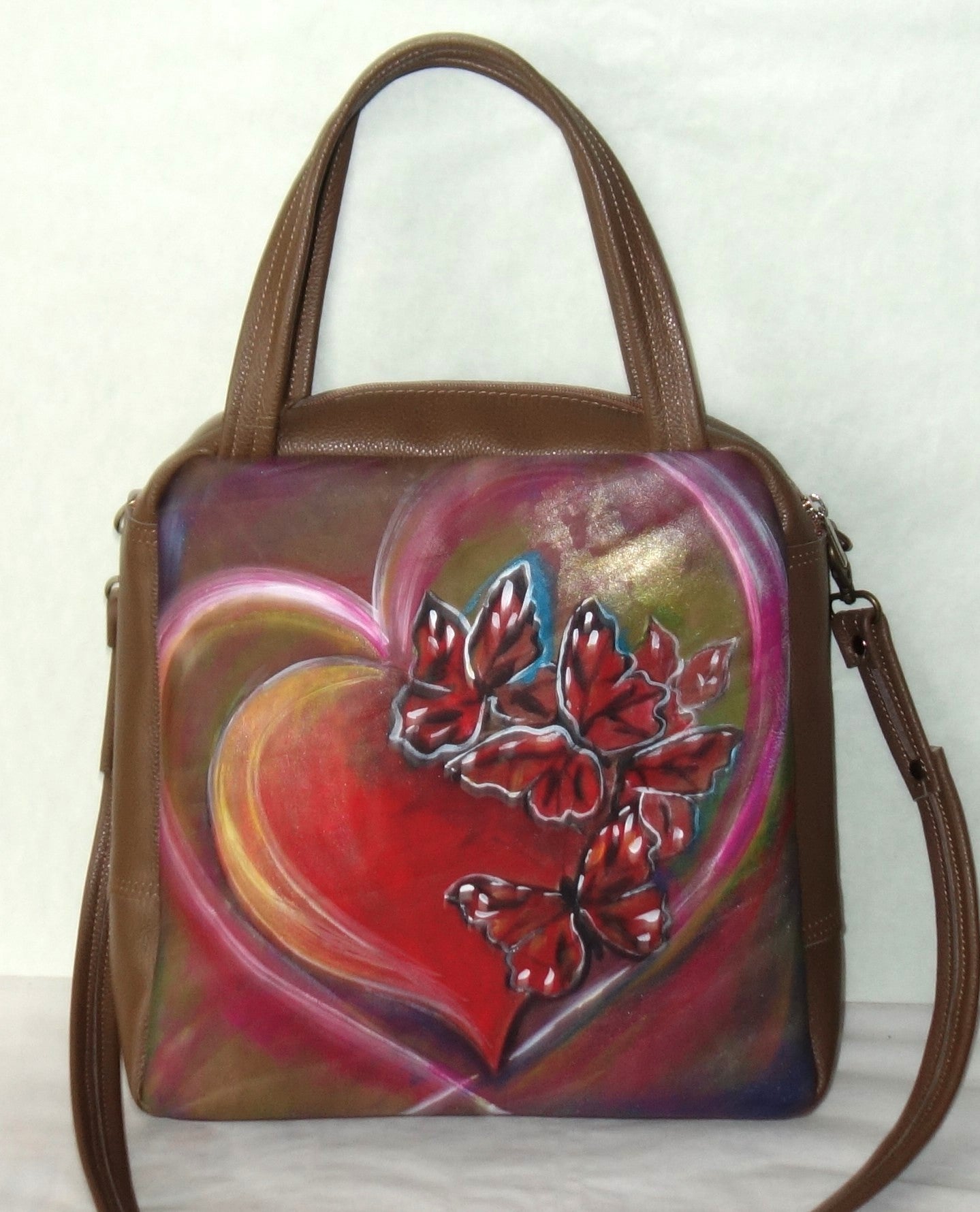 Poseta de piele naturala maro , de dimensiuni 28 cm latime pe centru, 28 cm inaltime , baza de 8 cm. Pictata manual cu vopsele speciale pentru piele. Captusita, cu doua buzunare interioare, se inchide cu fermoar. Fermoar exterior pe spate.