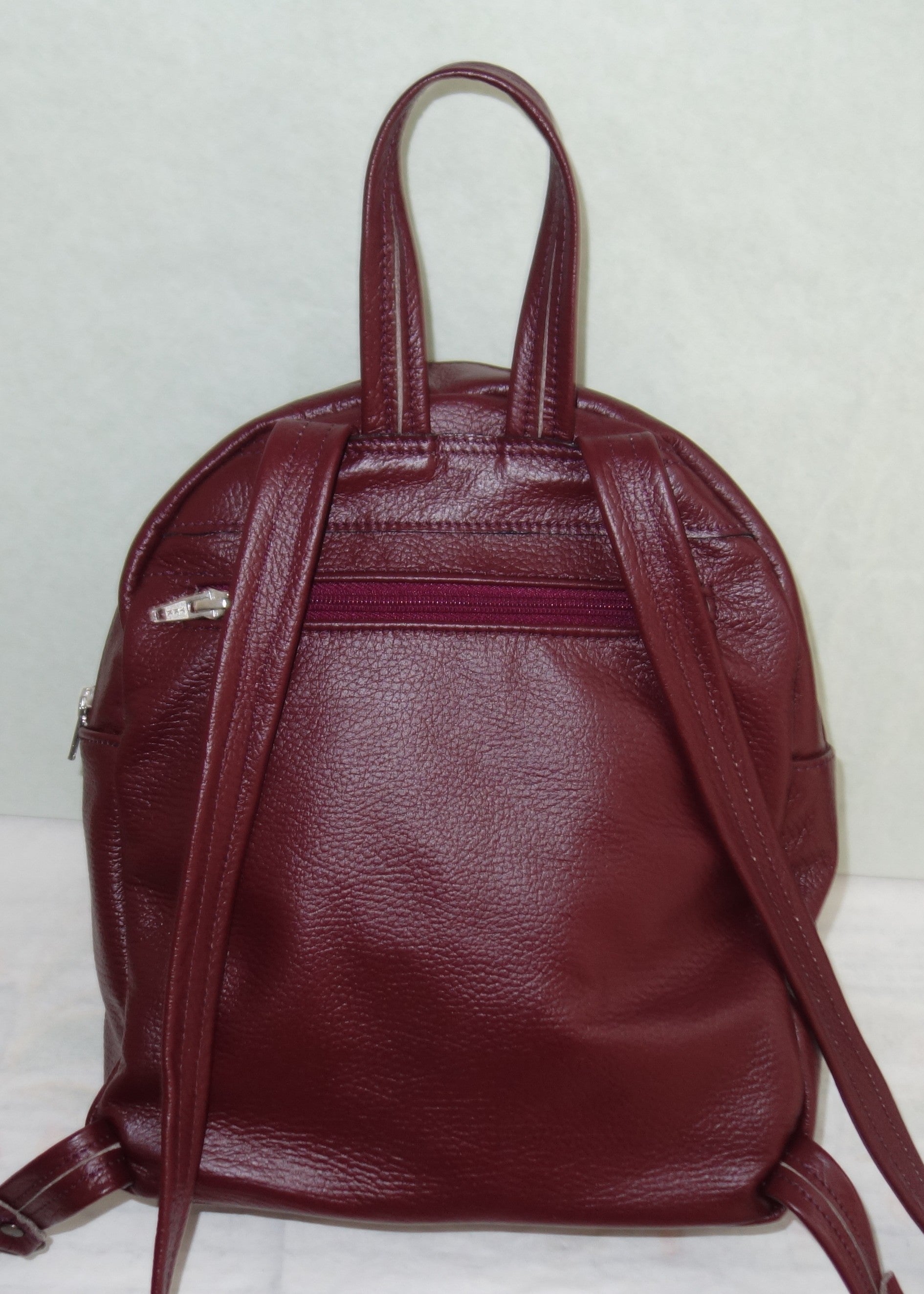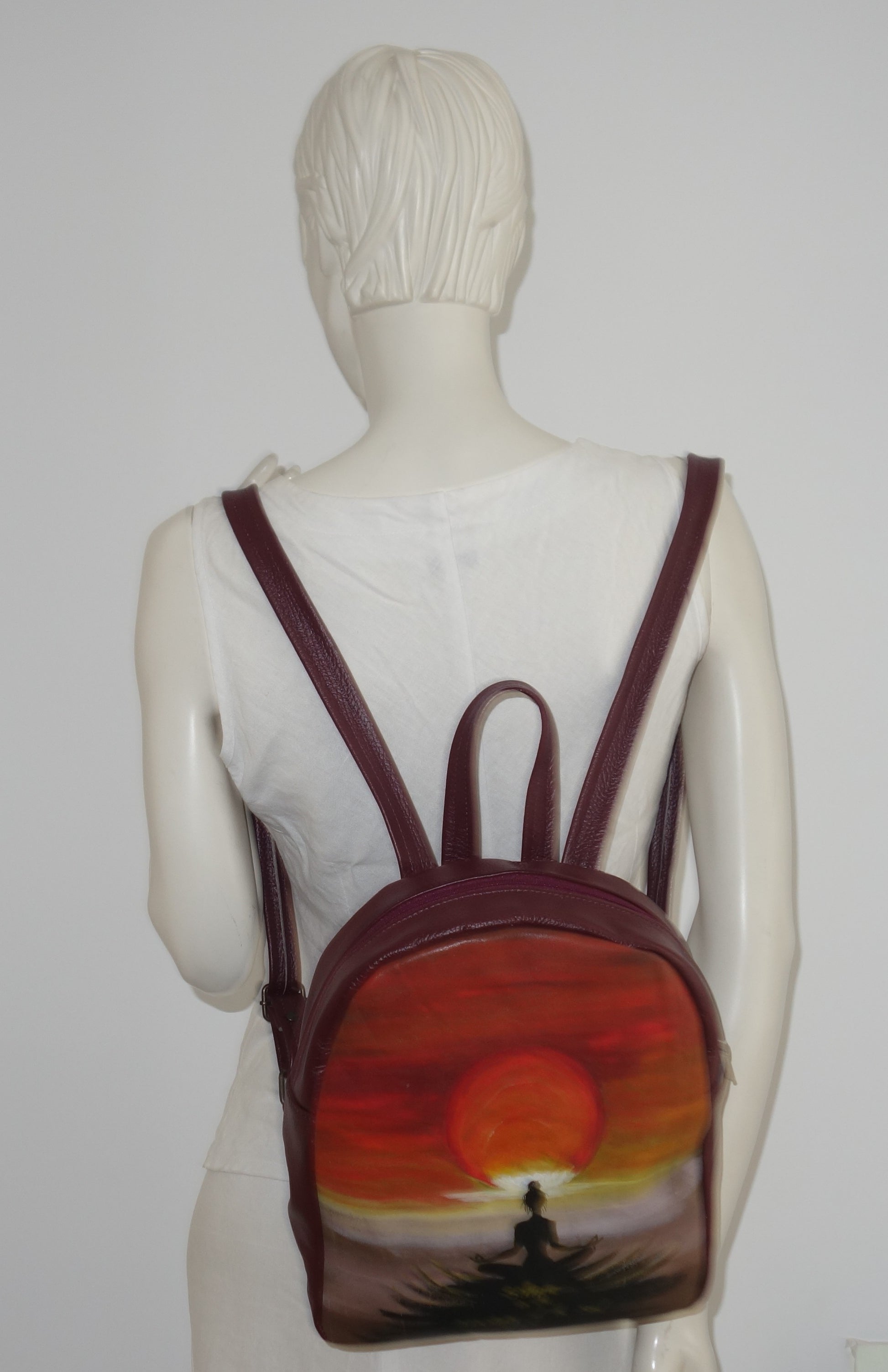 Rucsac de piele naturala visinie, de dimensiuni 30 cm inaltime, 25 cm latime sus, baza de 10 cm. Captusit, cu doua buzunare interioare, dintre care unul cu fermoar. Se inchide cu fermoar. Barete de umar reglabile. Fermoar exterior pe spate. Pictat in culori speciale pentru piele