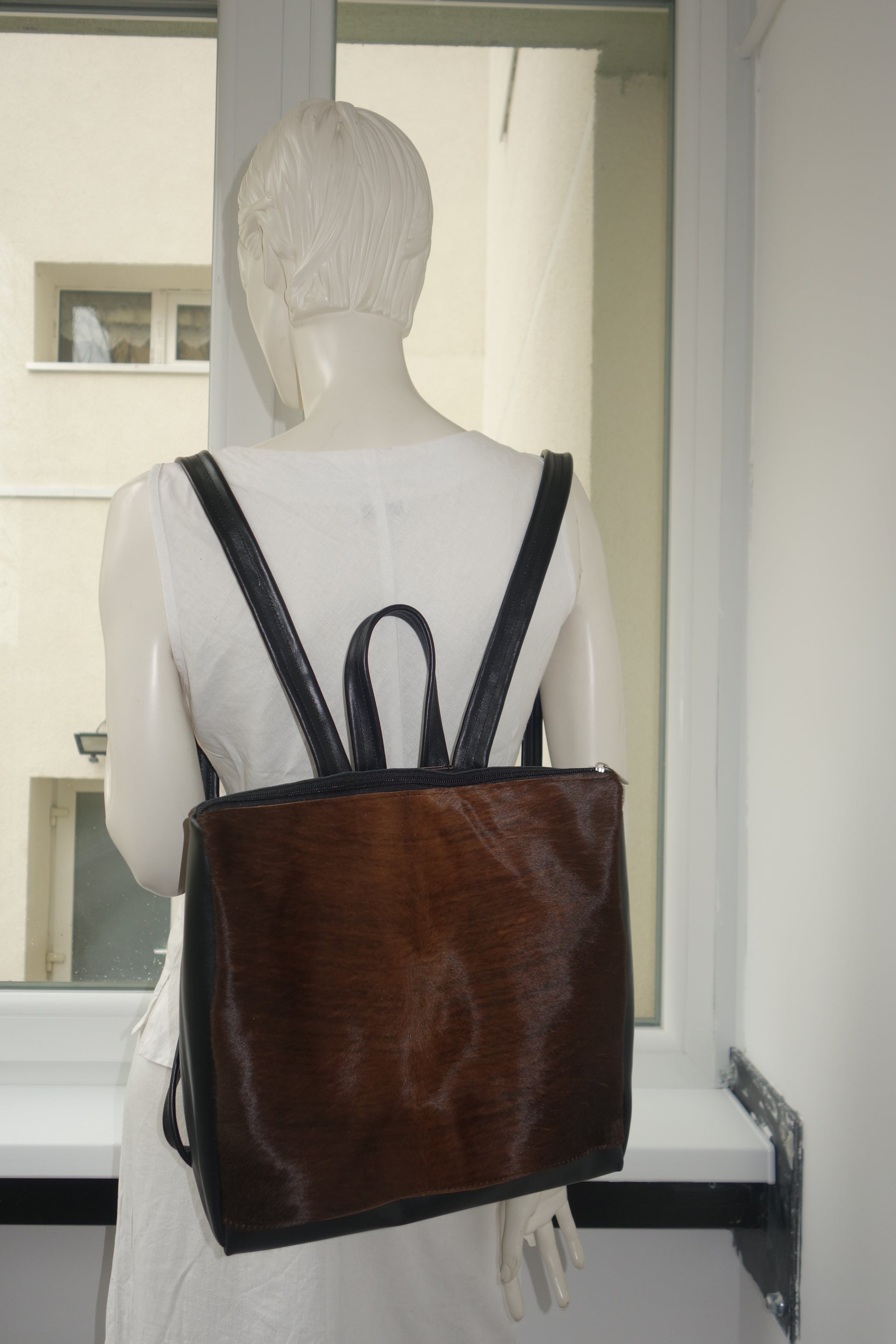 Rucsac de piele naturala neagra si blanita naturala , de dimensiuni 30 cm inaltime , 30 cm latime, baza de 10 cm . Captusit , cu doua buzunare interioare , dintre care unul cu fermoar . Se inchide cu fermoar . Barete de umar reglabile .Fermoar exterior pe spate.