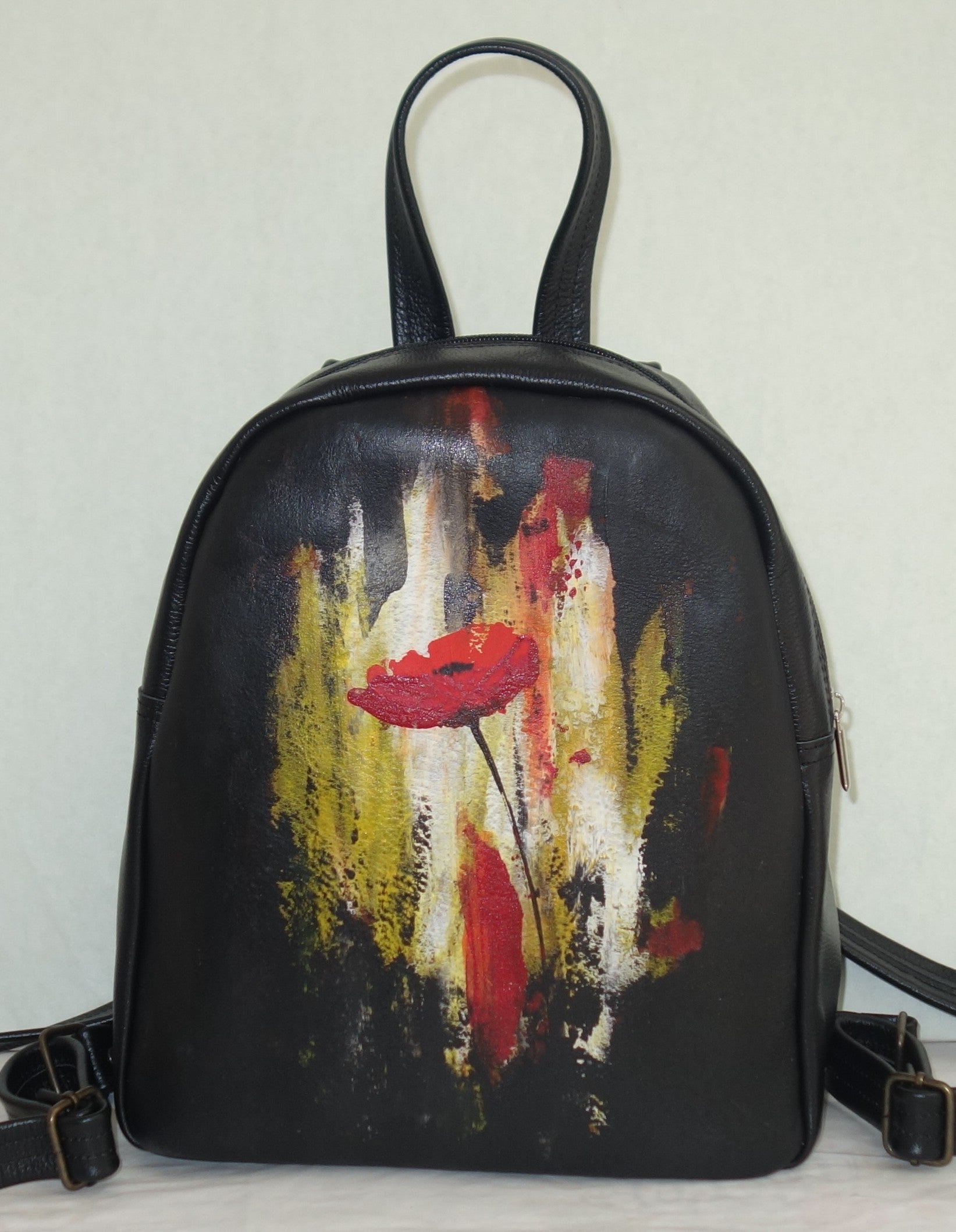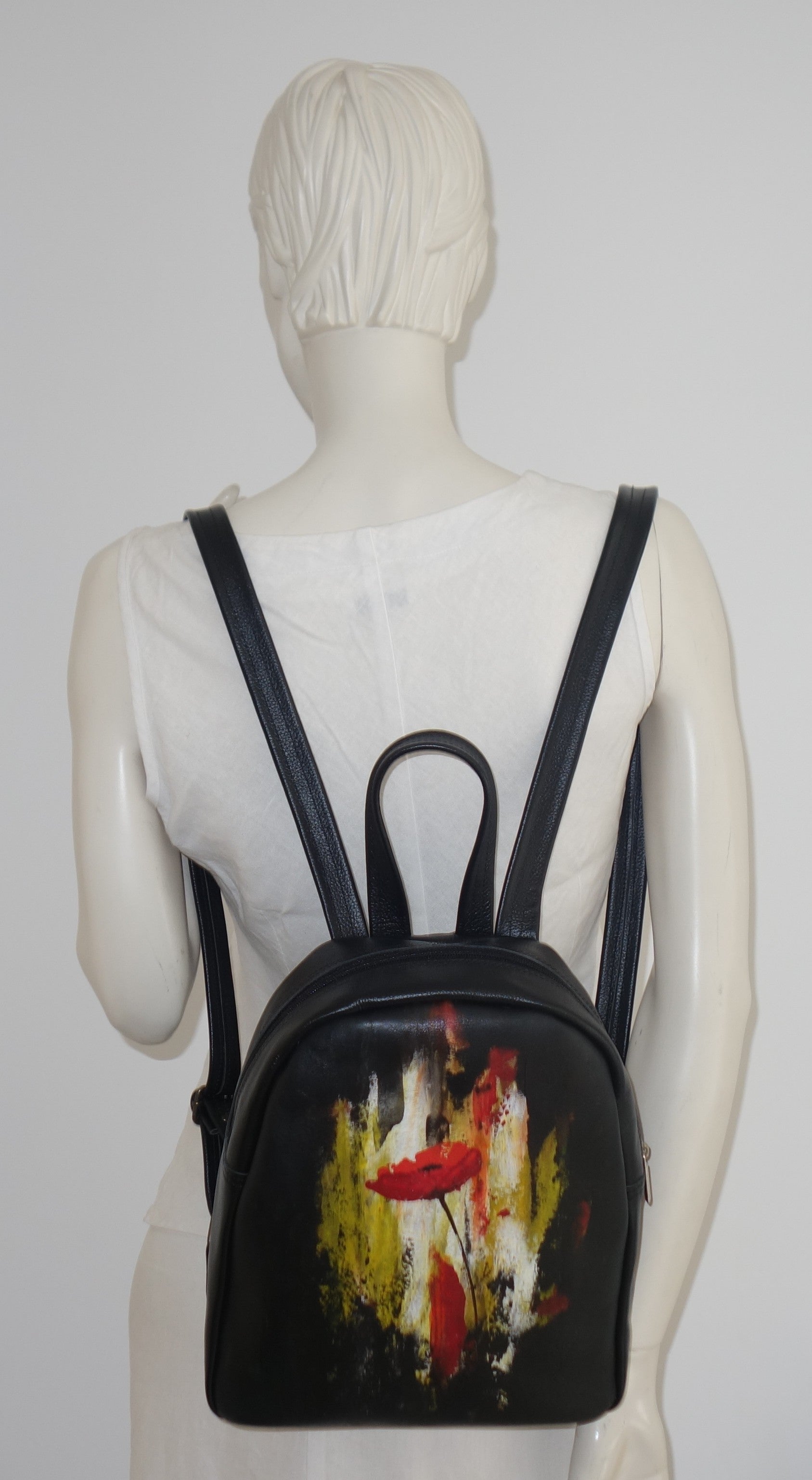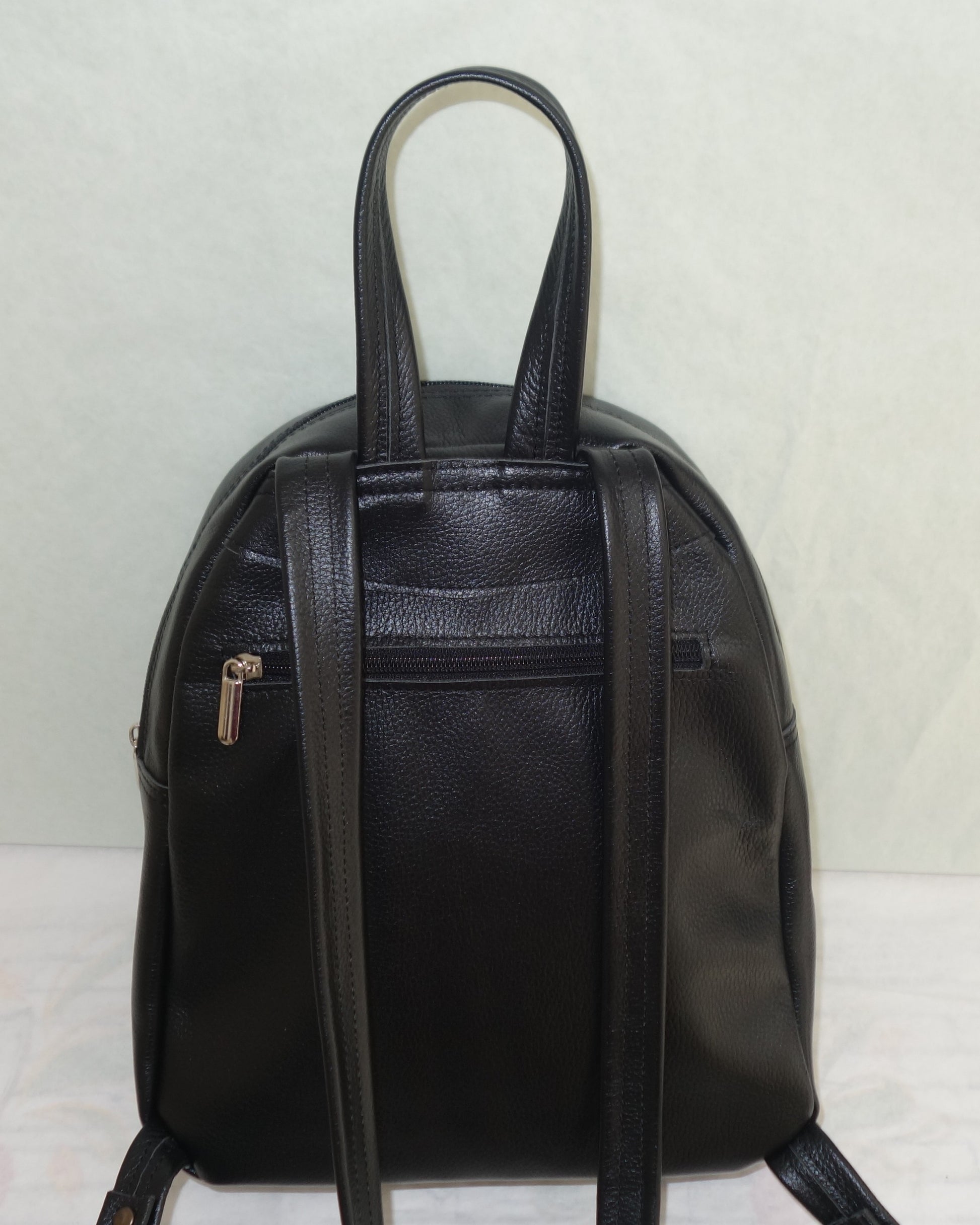 Rucsac de piele naturala neagra , de dimensiuni 30 cm inaltime, 25 cm latime, baza de 8 cm. Captusit , cu doua buzunare interioare , dintre care unul cu fermoar. Se inchide cu fermoar. Fermoar exterior pe spate. Barete de umar reglabile ca lungime.
