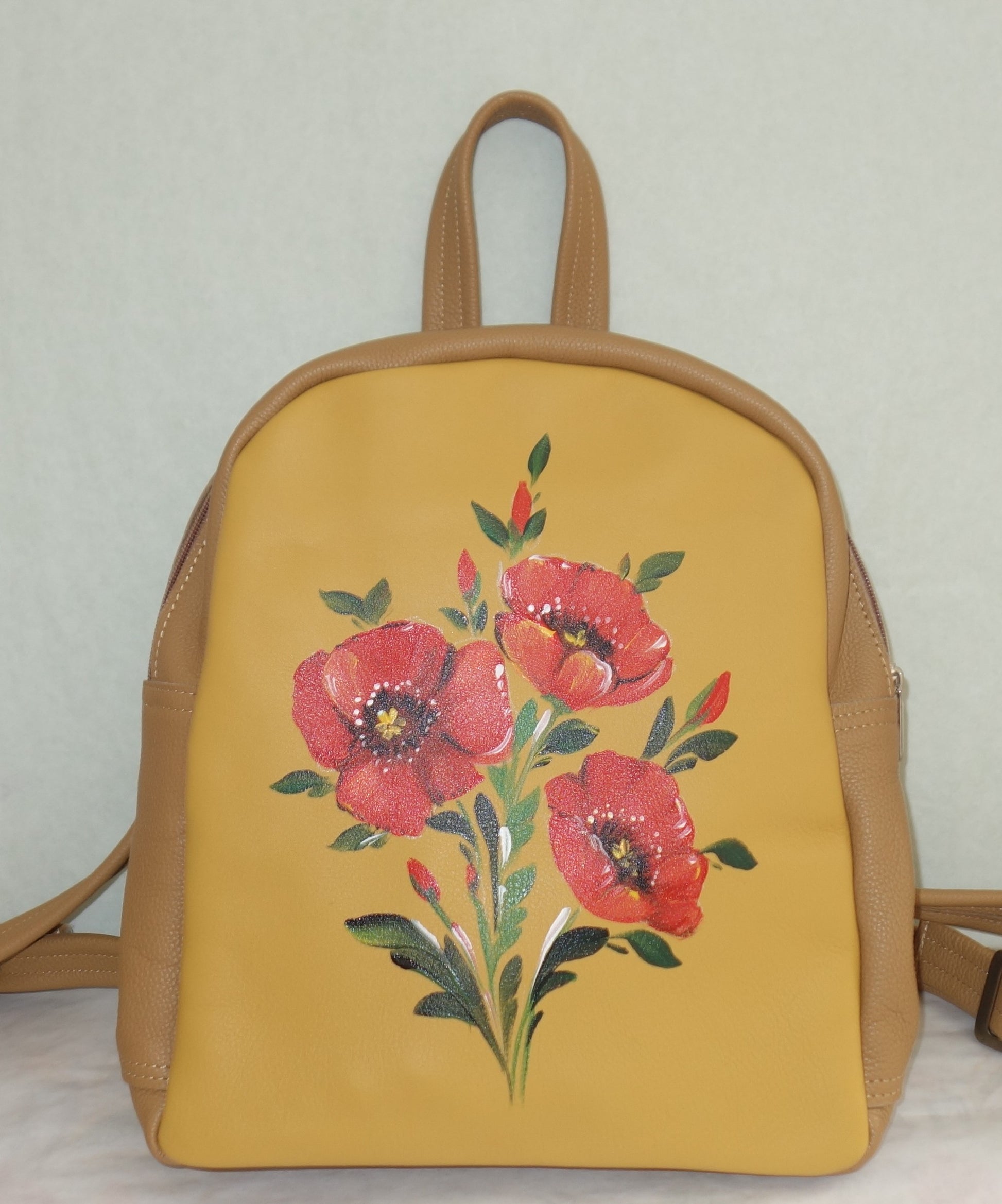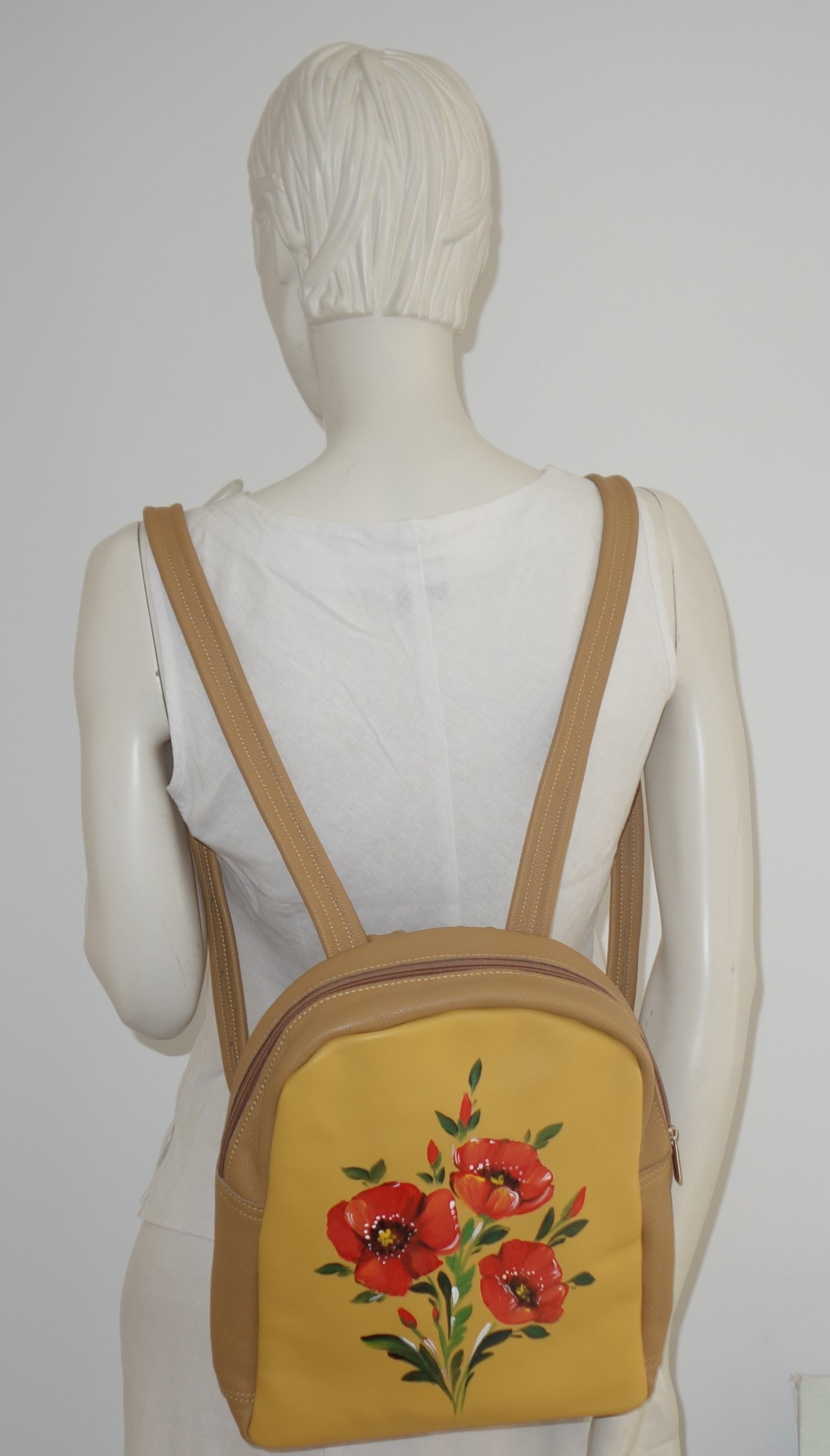 Rucsac de piele naturala cappucino si galben , pictat manual cu vopsele pentru piele, de dimensiuni 29 cm inaltime , 25 cm latime pe centru , baza de 10 cm . Captusit ,cu doua buzunare interioare, dintre care unul cu fermoar. Se inchide cu fermoar . Barete de umar reglabile ,fermoar exterior pe spate.