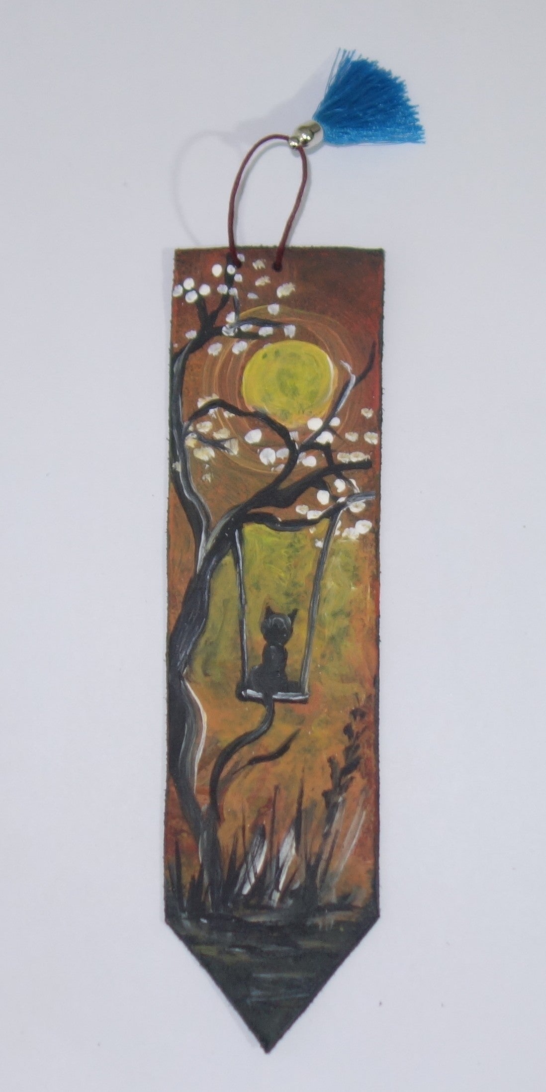 Semn de carte din piele naturala, de 19 x 5 cm, pictat manual. Unicat.