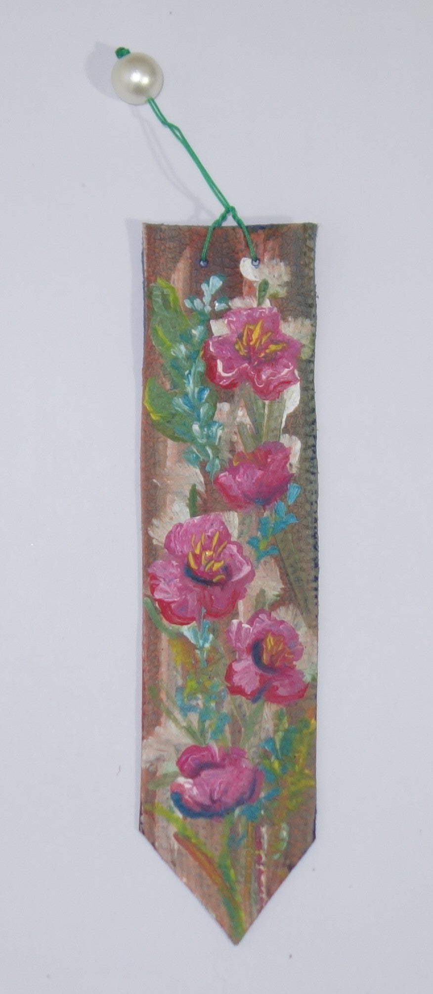 Semn de carte din piele naturala, de 19 x 5 cm, pictat manual. Unicat.