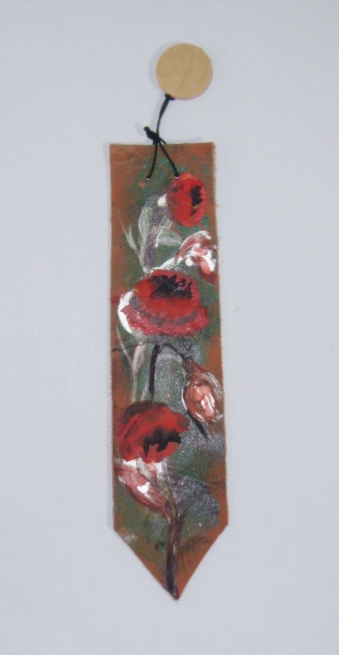 Semn de carte din piele naturala, de 19 x 5 cm, pictat manual. Unicat.